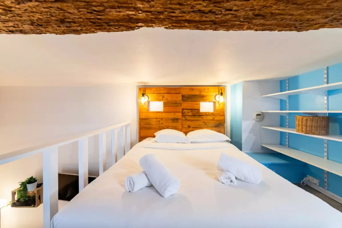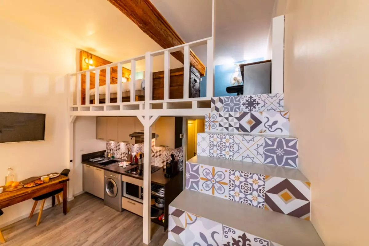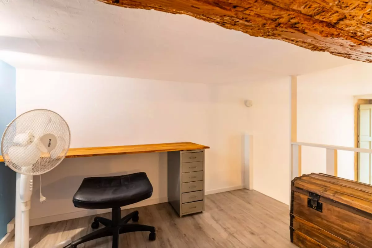 - Upstairs, the duplex features a bedroom area with a bed and a desk. Please note that the ceiling height is not high. It will not be possible for an adult to move around standing up.