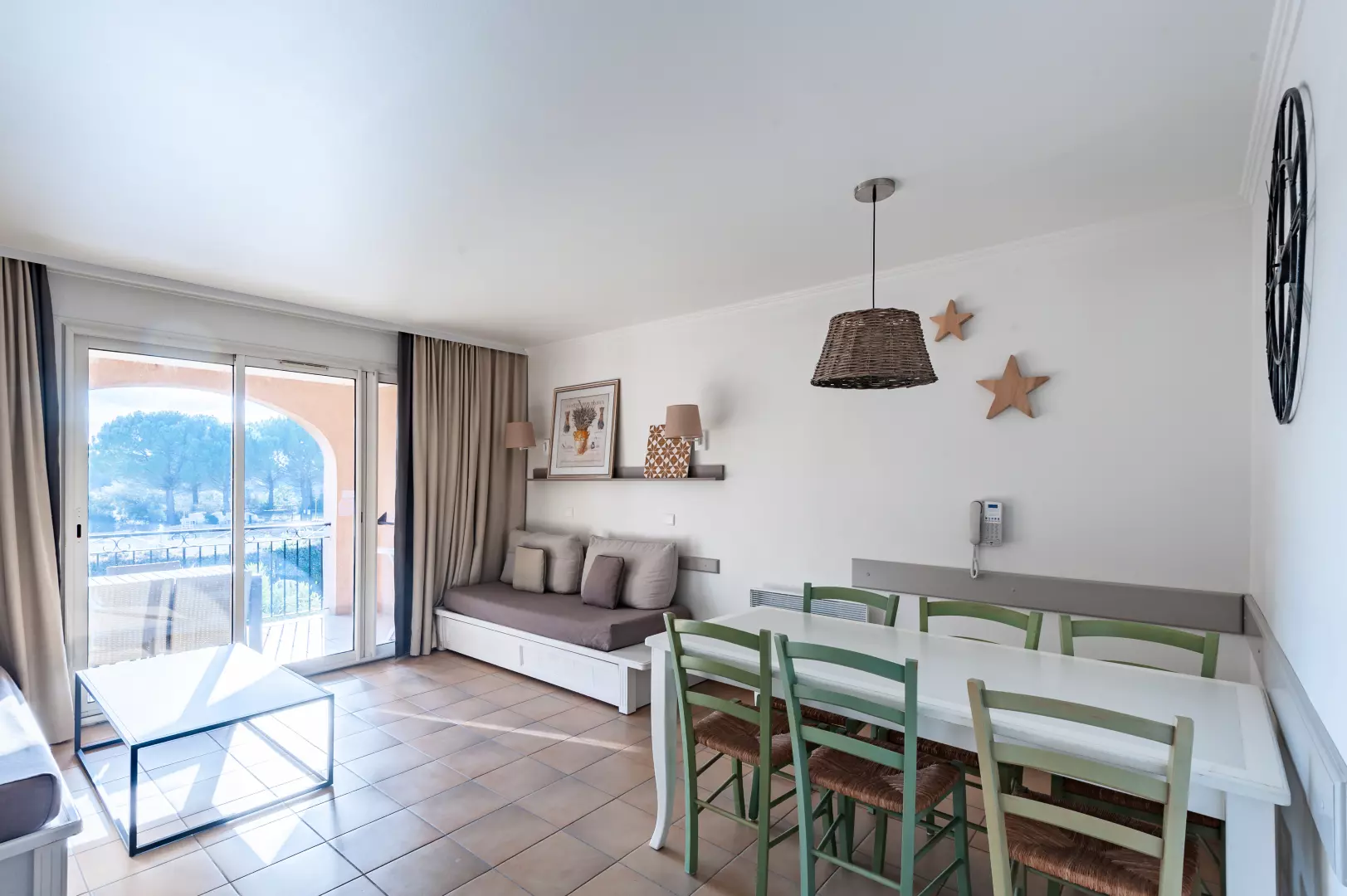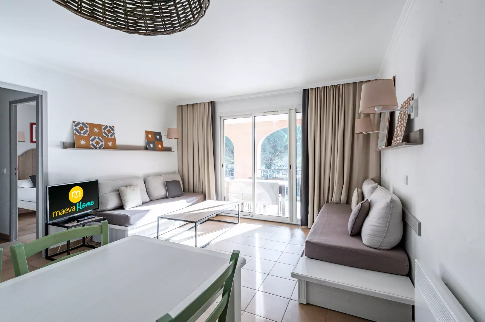 The advantages of your rental: Located on the 1st floor of a residence without an elevator, this accommodation benefits from an ideal location in the village center, less than 100 meters from shops and activities. Its south-facing covered terrace offers a pleasant view of the swimming pool. Designed to accommodate up to 6 people, it includes two bedrooms, a living room with a sofa bed, two bathrooms, and a well-equipped semi-open kitchen (microwave, dishwasher, large refrigerator). A reserved covered parking space completes the advantages of this practical and well-located accommodation.