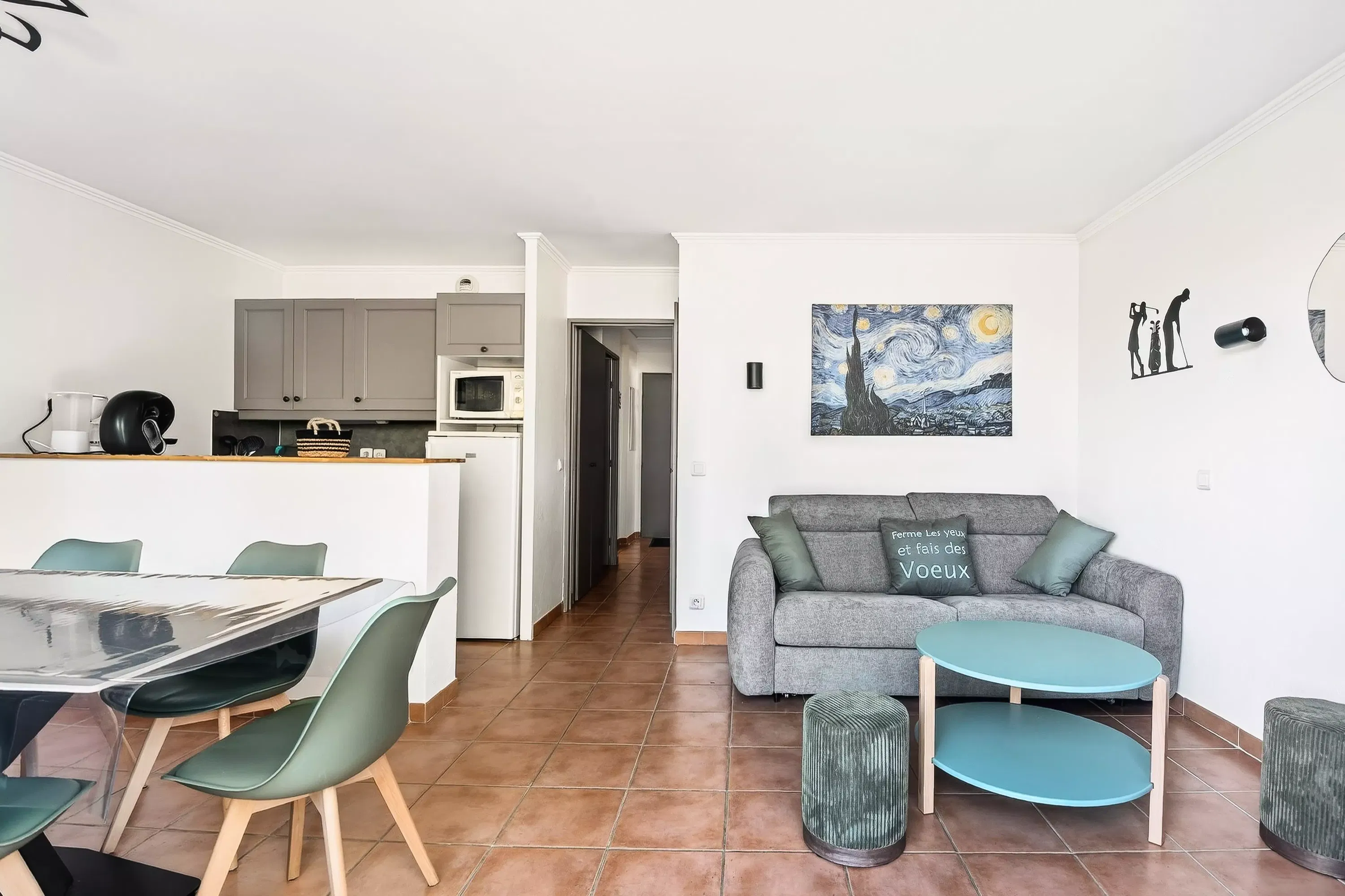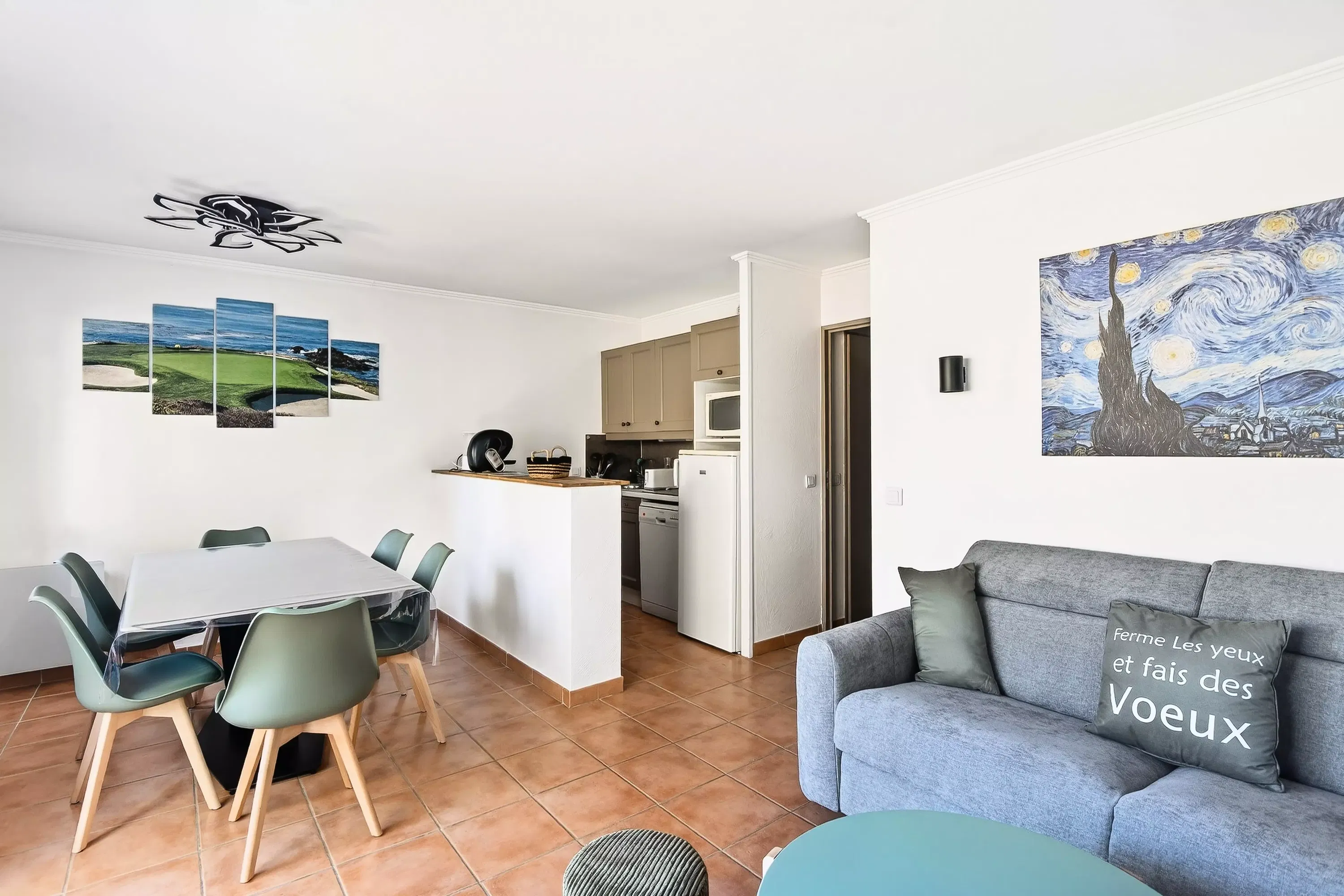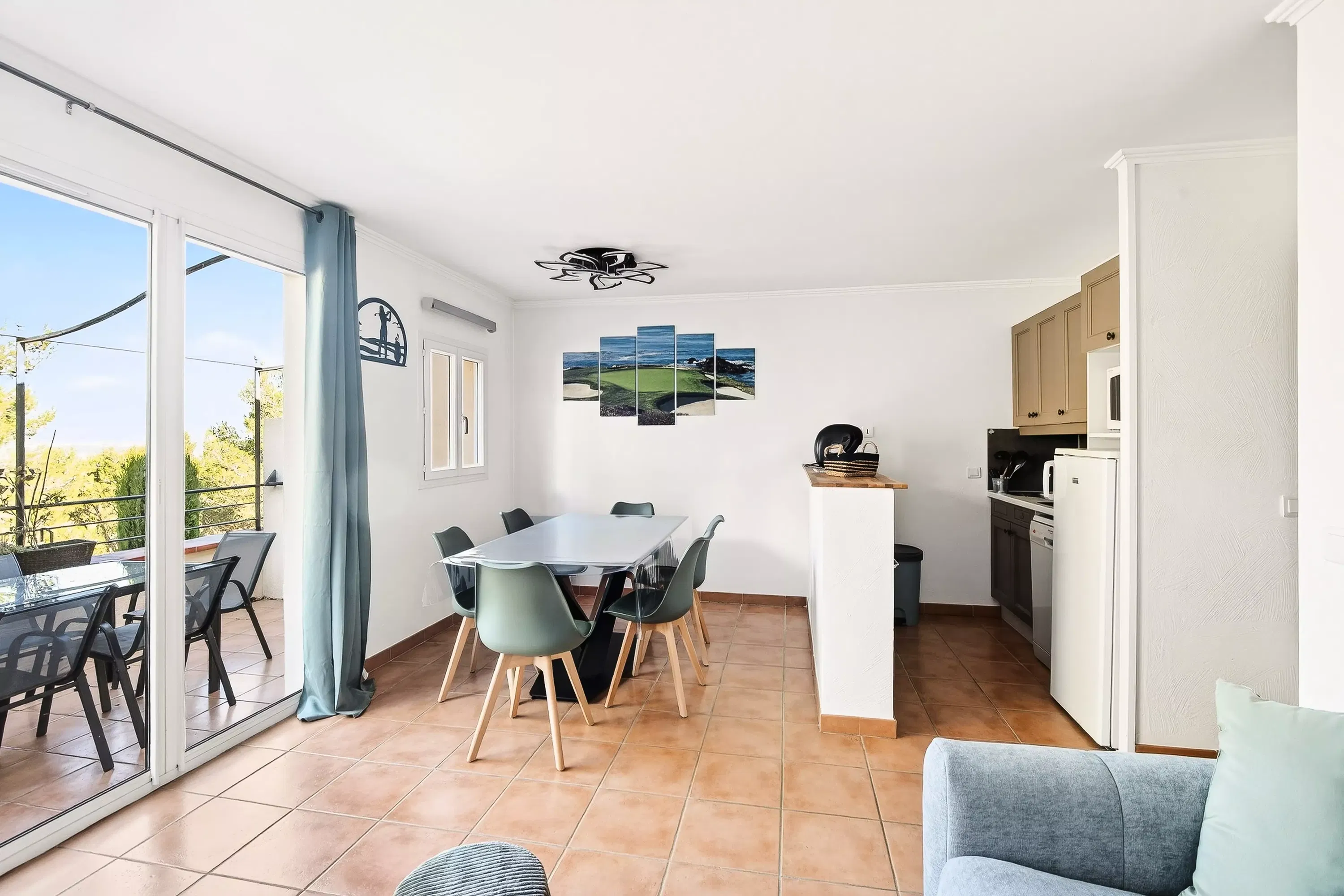 The advantages of your Super Home rental: A bright and air-conditioned apartment, ideally located in the heart of the village, just steps from shops and activities. Nestled on the floor, it offers comfortable living space with two bedrooms, a welcoming living room, and a fully equipped semi-open kitchen. You'll enjoy a pleasant northeast-facing terrace with views of the village, perfect for al fresco dining, as well as private covered parking—a real bonus in the village center. A practical and welcoming address for a simple holiday with family or friends.