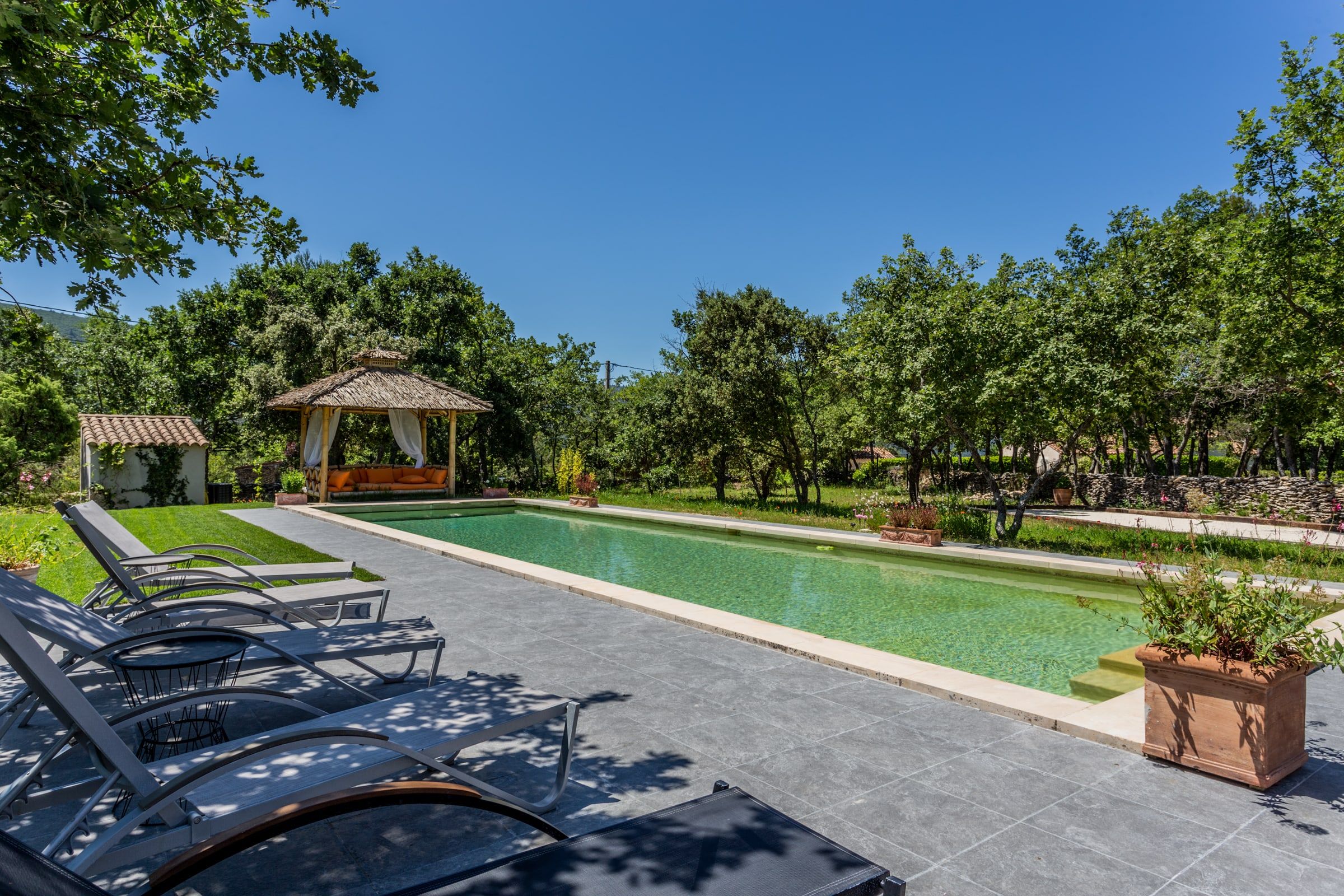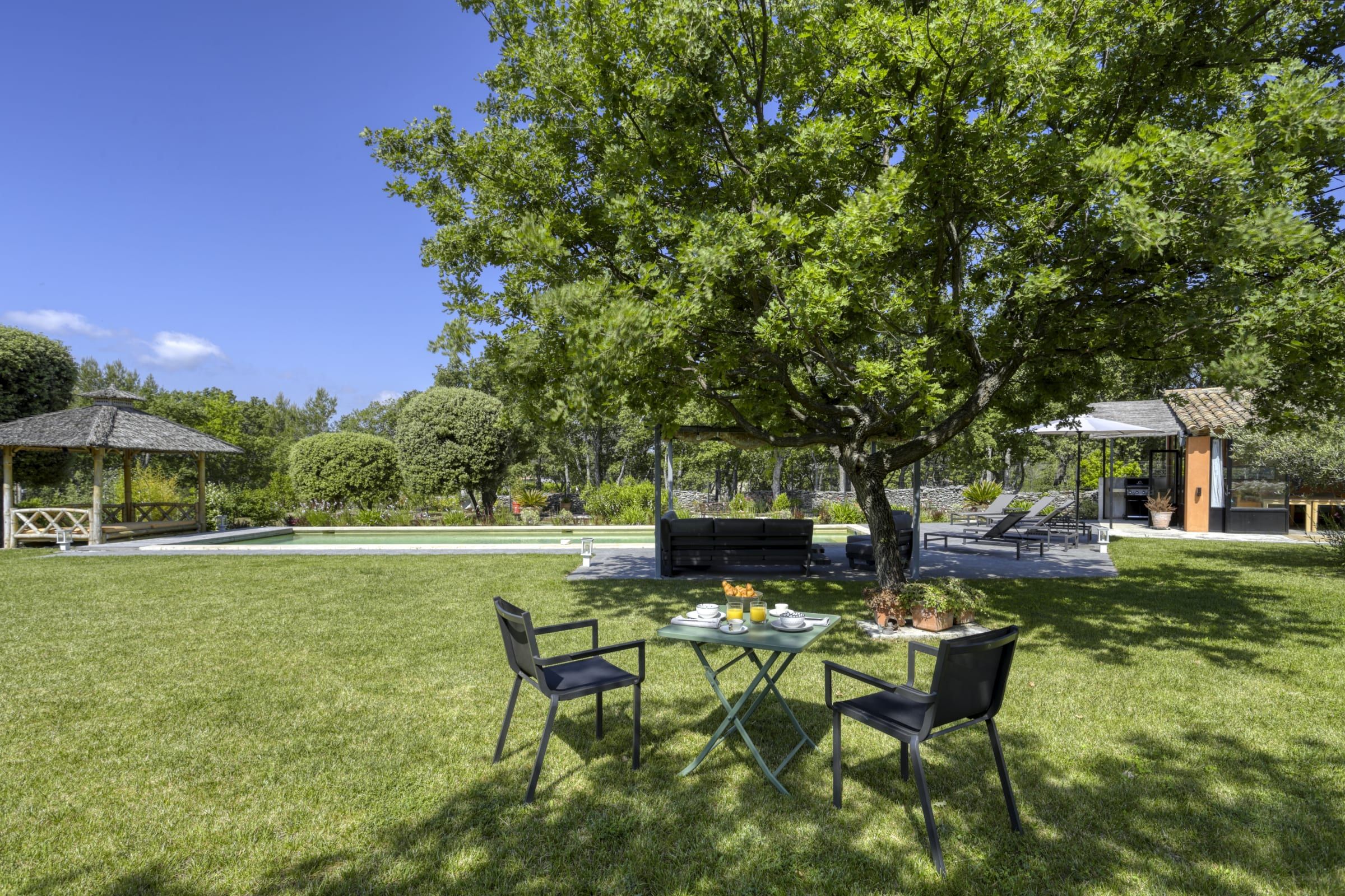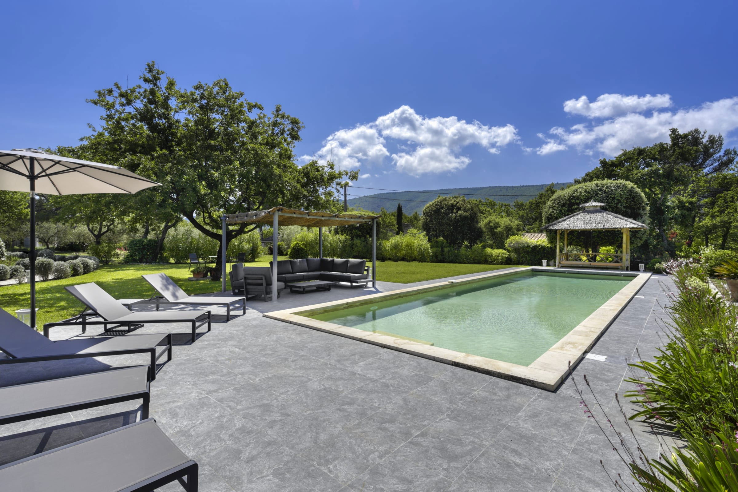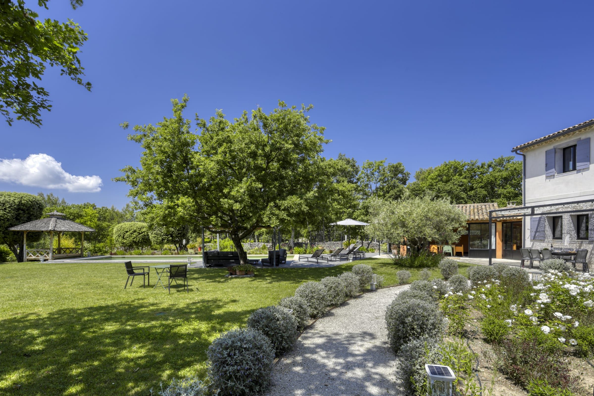 The enclosed and wooded garden of 4,300 sqm contains a lovely play area and all the equipment for comfort and rest, including a lovely gazebo to spend hours in peace, shaded from the heat where you can enjoy a breathtaking view of the Luberon.