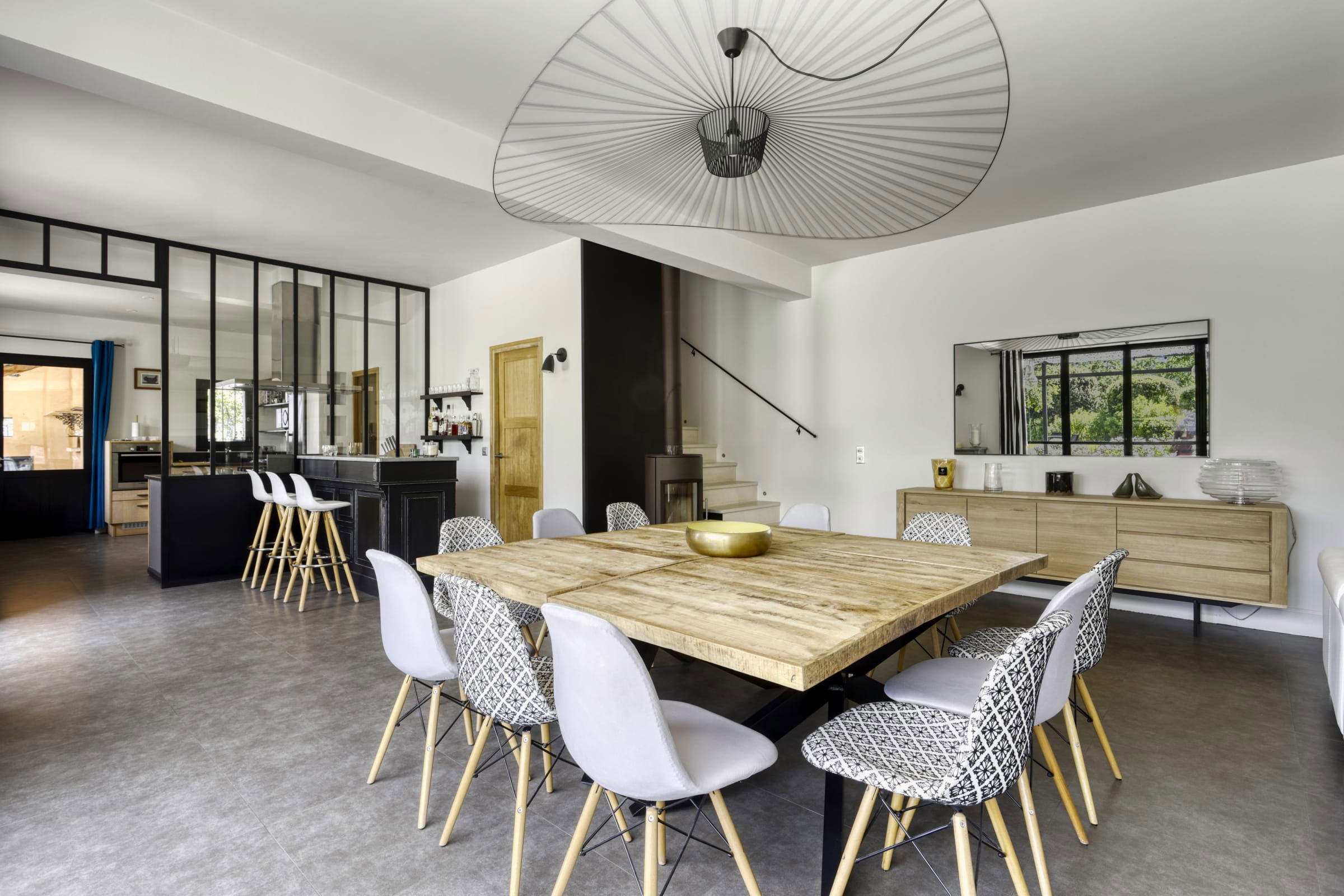 - Large dining / living room with bar area, wood burning stove, flat screen TV and fireplace, leading to the terrace
