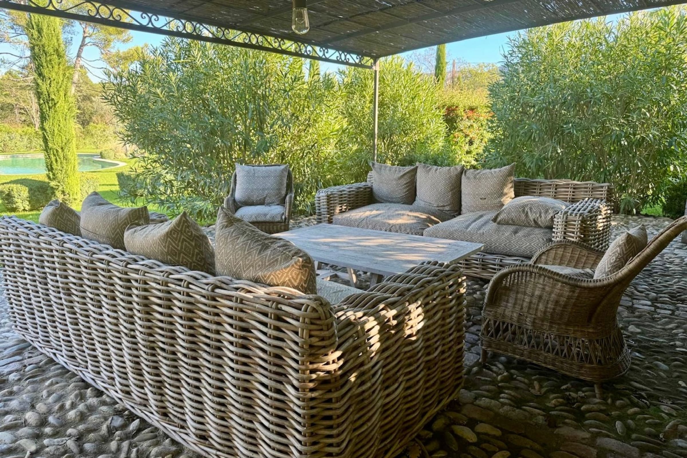 A large outdoor dining area beneath the cool shade of the trees can seat up to 14 guests, providing the perfect setting for unforgettable meals. Closer to the house, a shaded terrace with a pergola offers another delightful spot for simple, relaxed dining while admiring the view of the gardens.