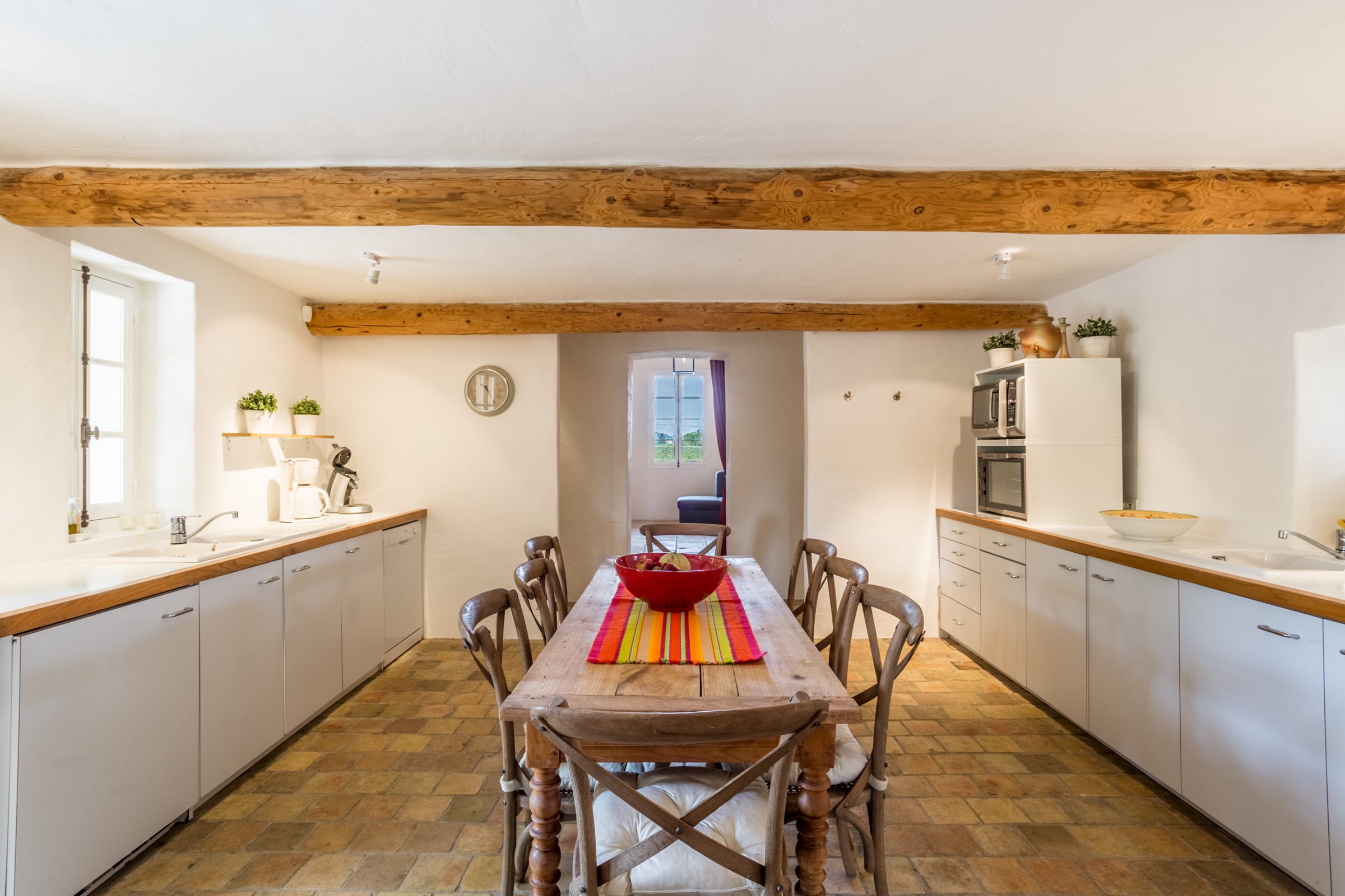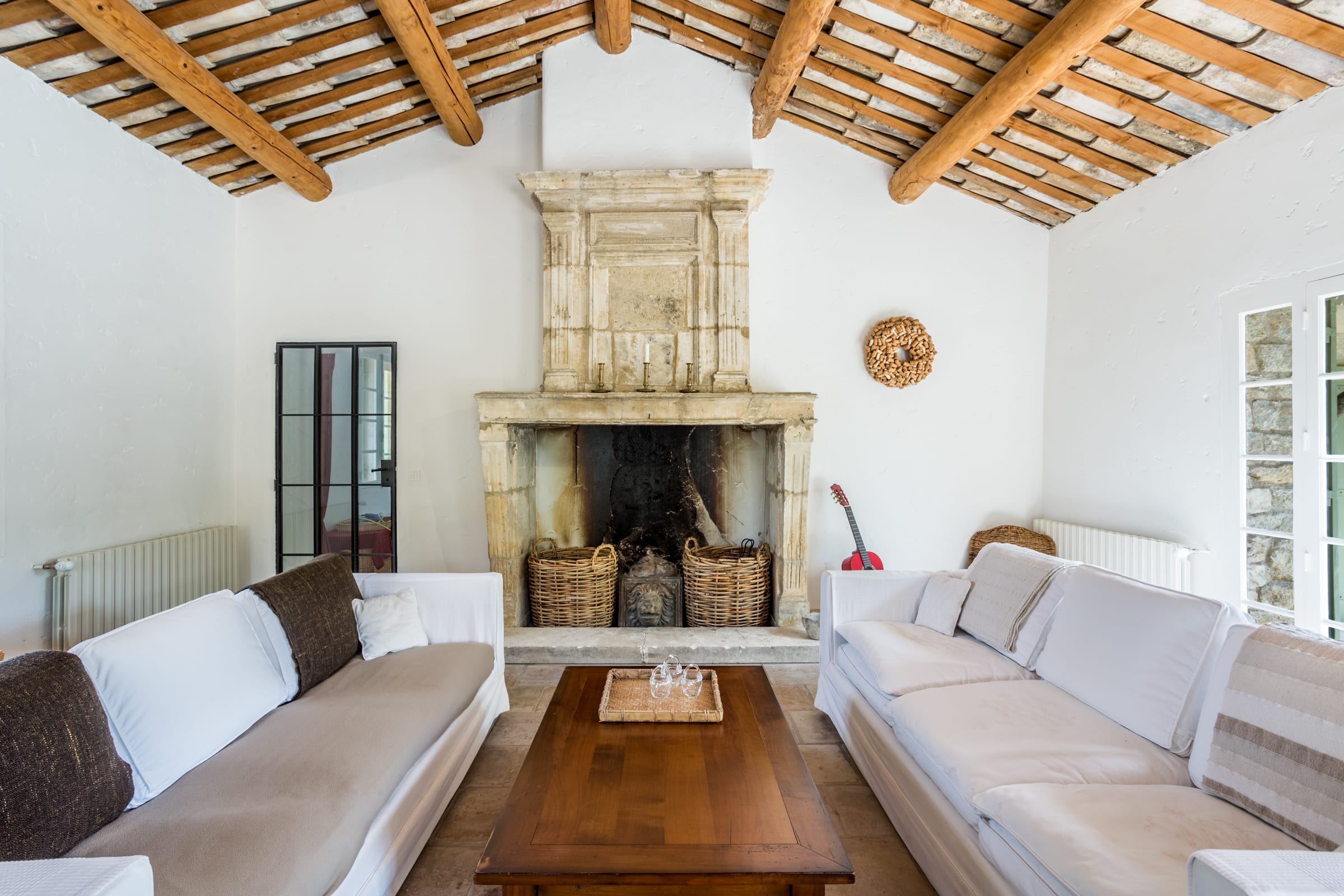 Fitted kitchen with access to the terrace, large lounge with fireplace and dining area, TV room next to the kitchen, second lounge with fireplace.