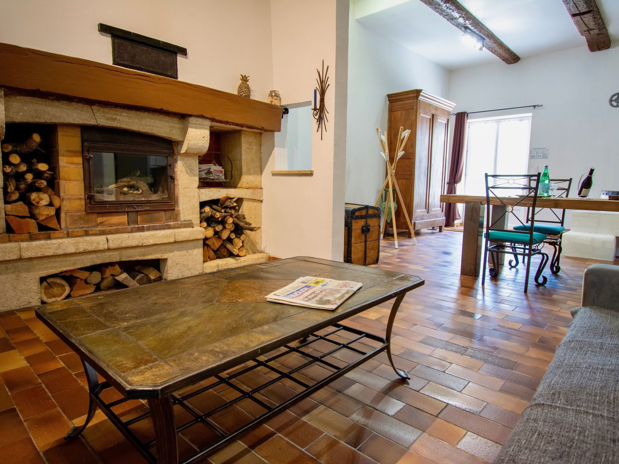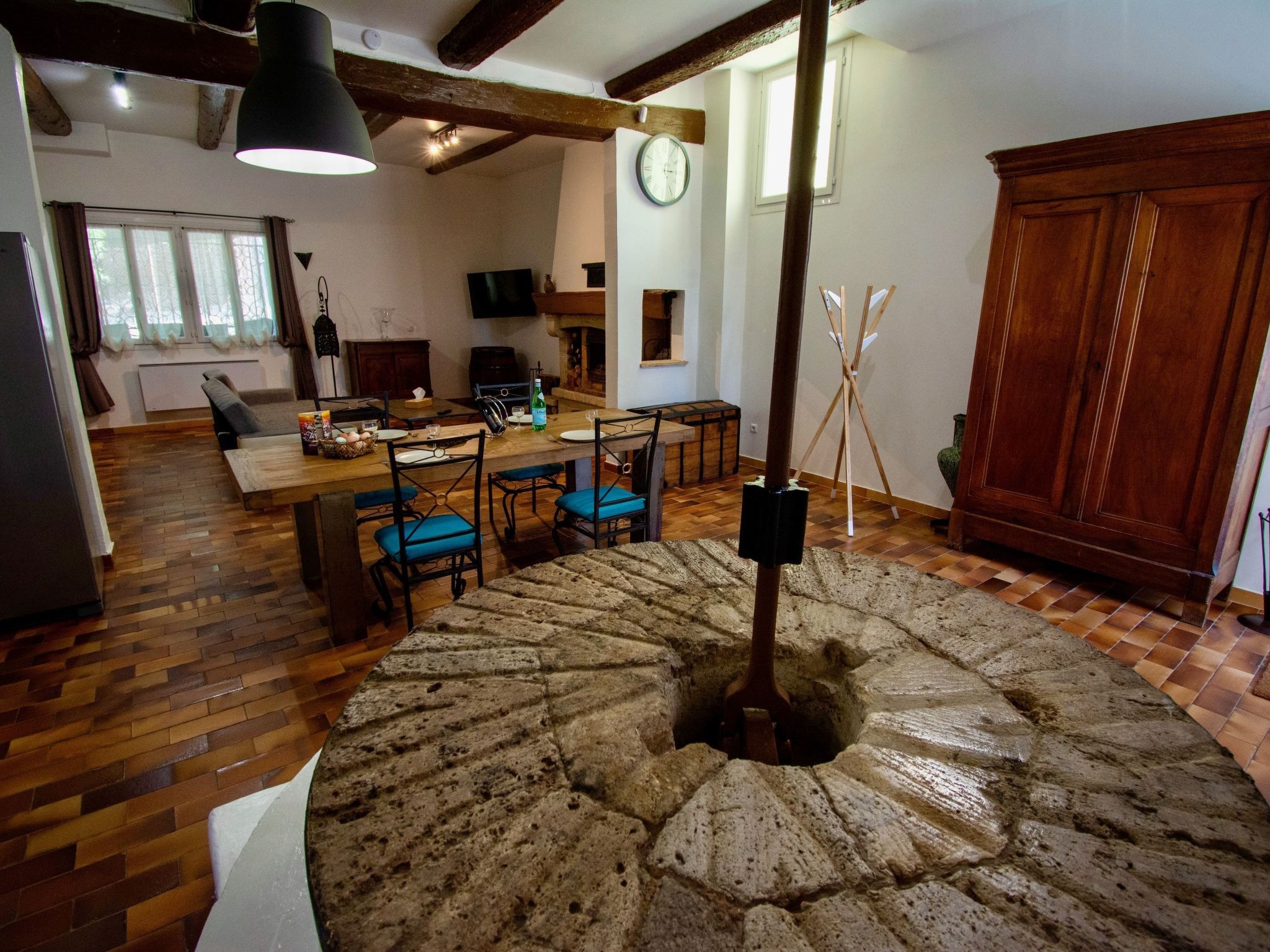 The dining room is in front of the Moulin with its open kitchen, a large dining table and a library.