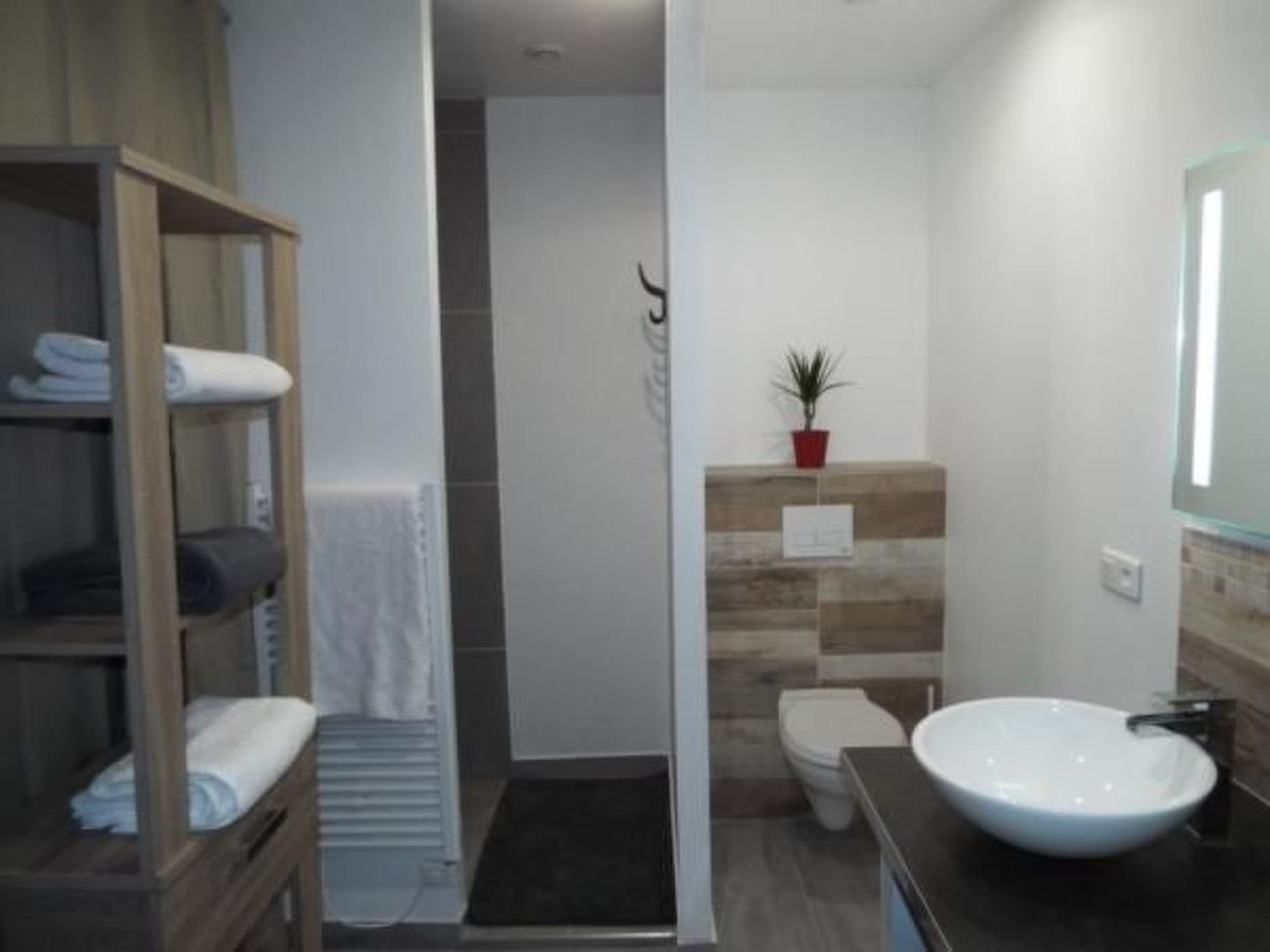 The bathroom has a washbasin and walk-in shower, and a separate toilet.