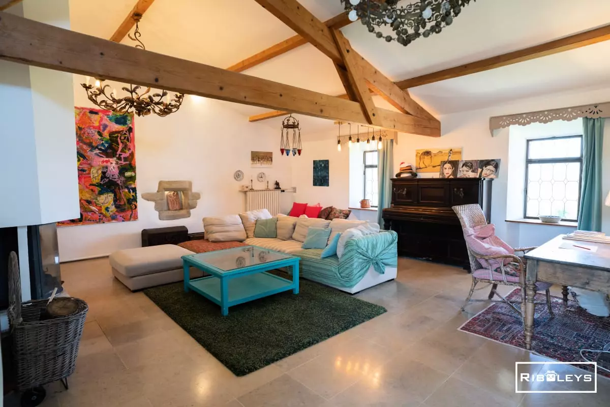 A spacious living room with fireplace, piano, board games, books, desk and sofa for relaxing or getting together in a friendly atmosphere.