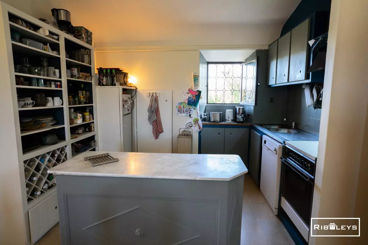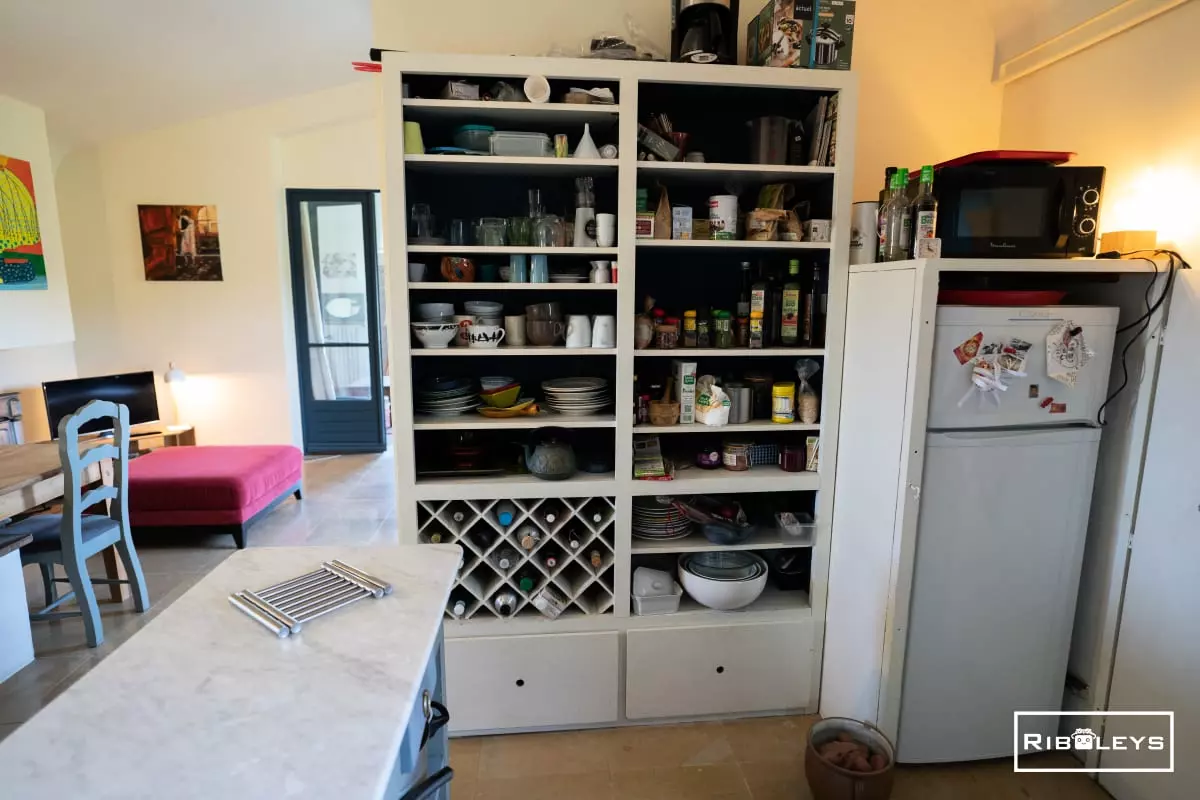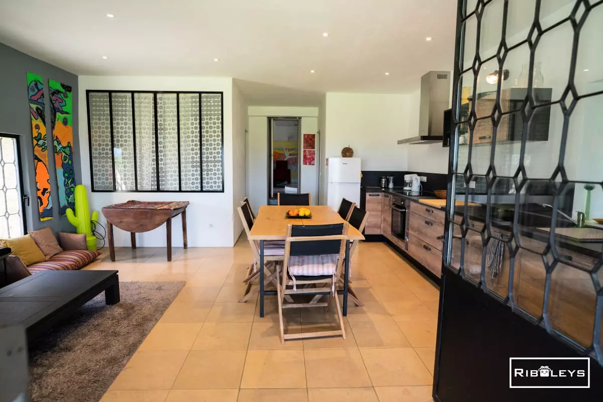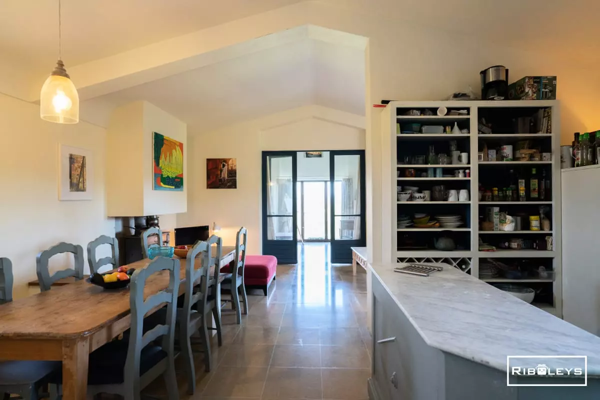 A second kitchen opens onto a large living room leading to a shaded terrace.