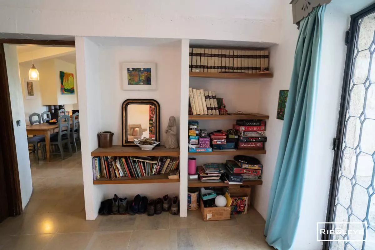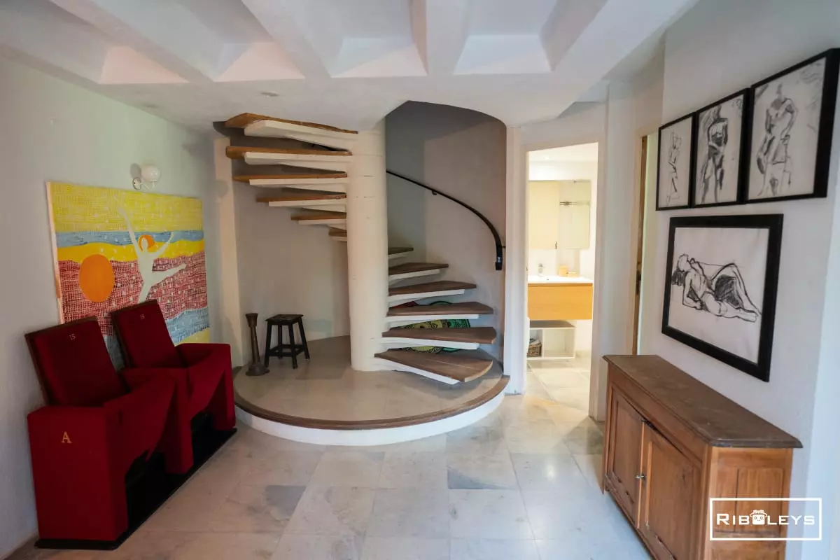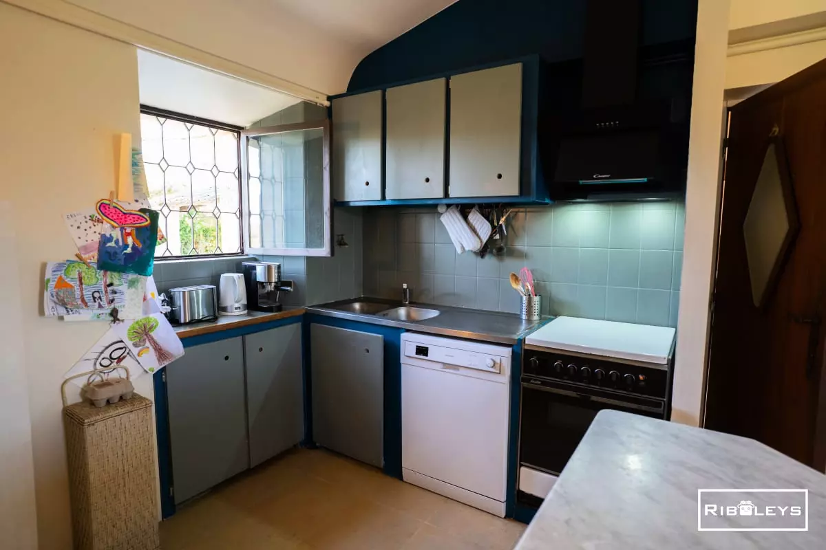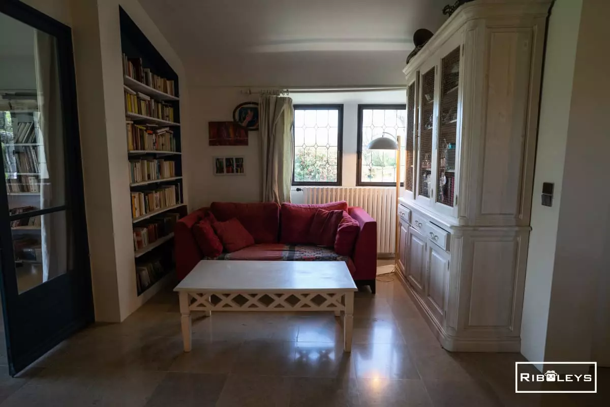 A second kitchen opens onto a large living room leading to a shaded terrace.