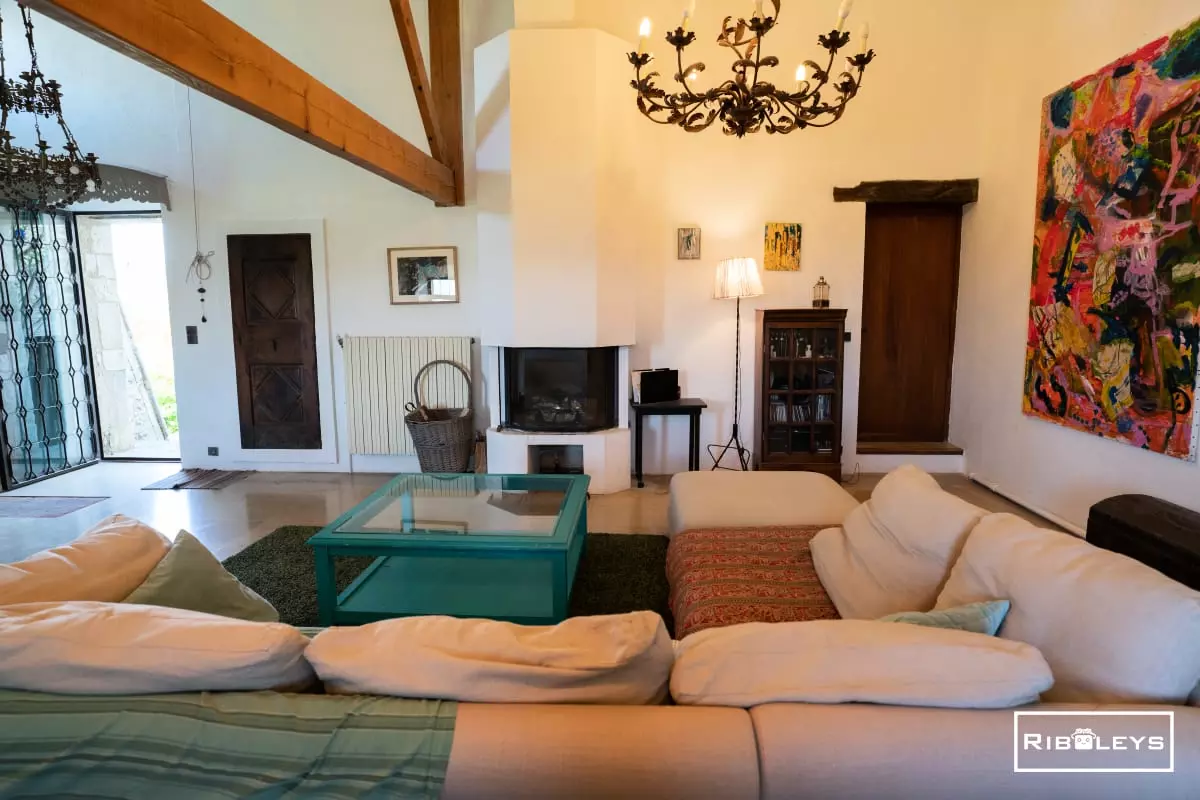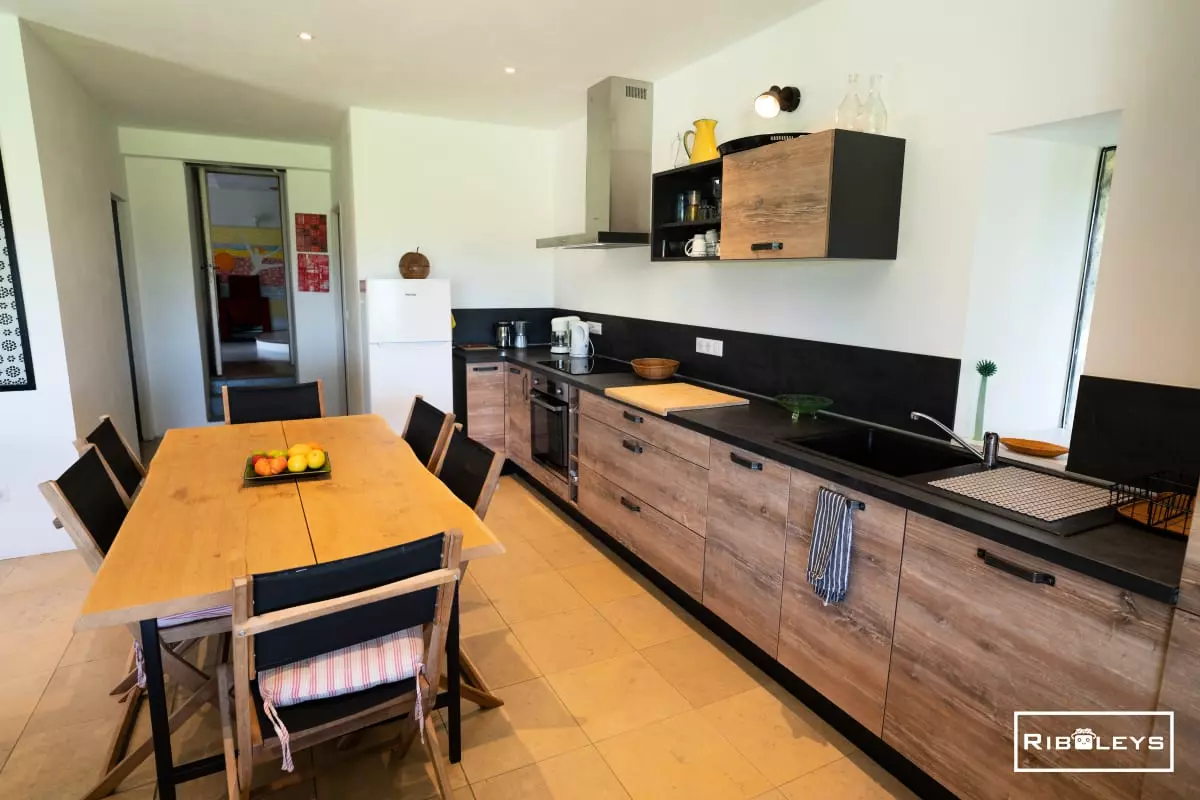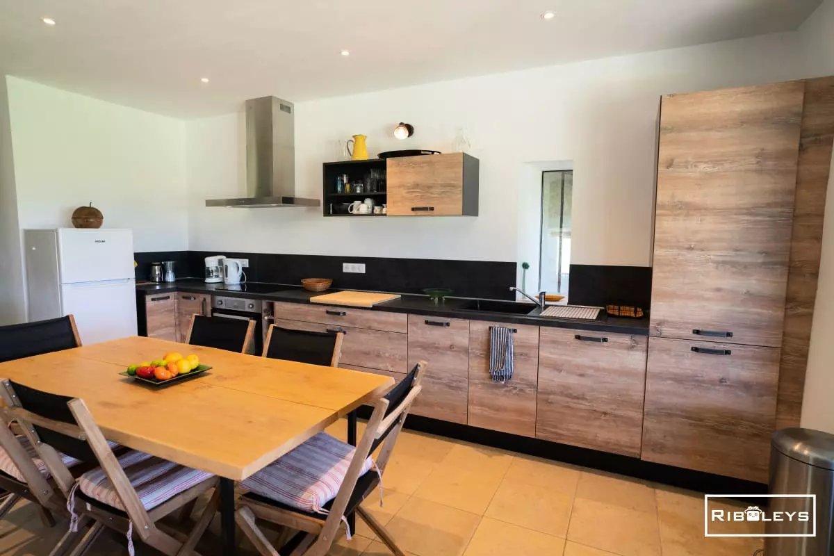 A large dining room opening onto a fully equipped kitchen (dishwasher, refrigerator, oven, gas stove…), with a TV area and wood-burning stove.