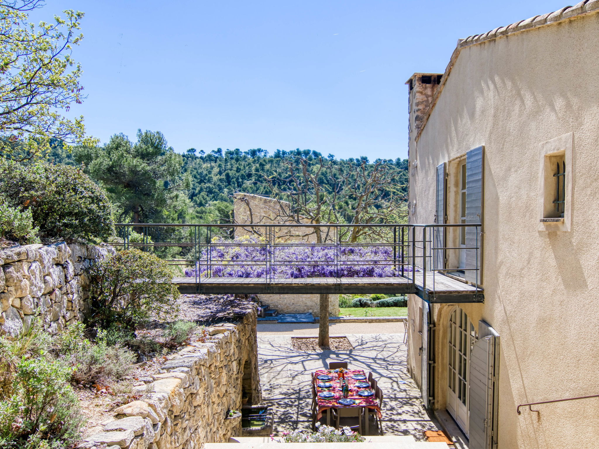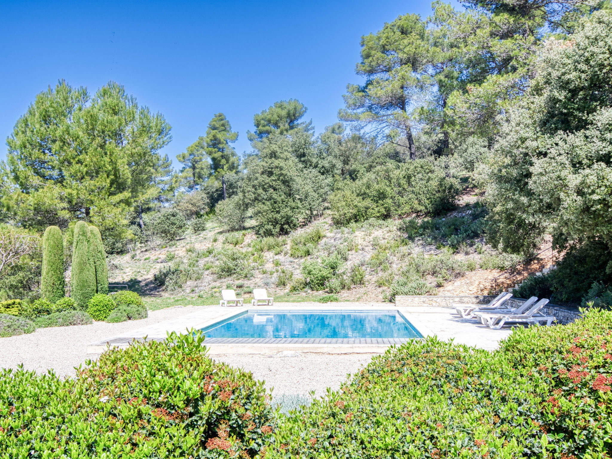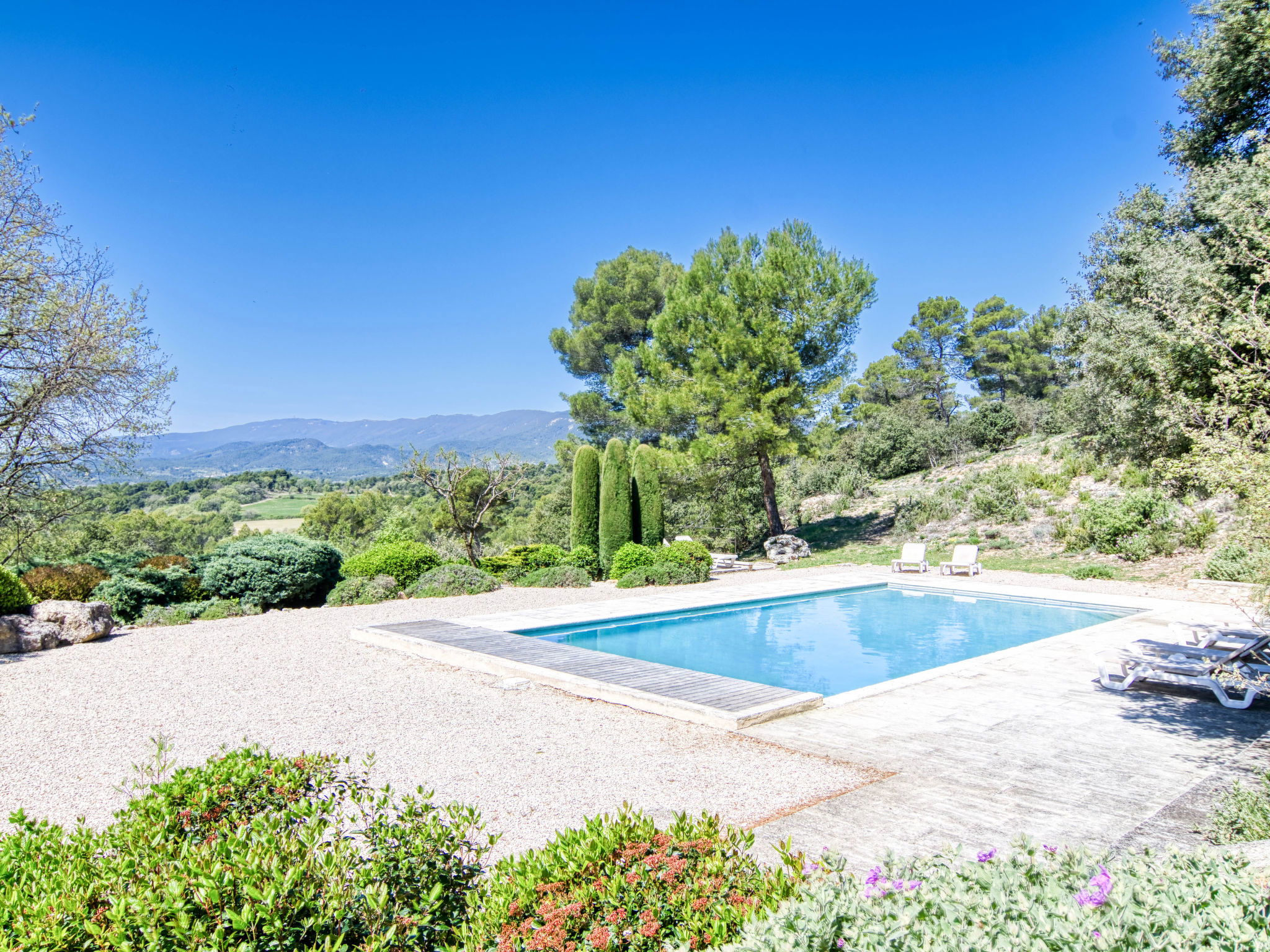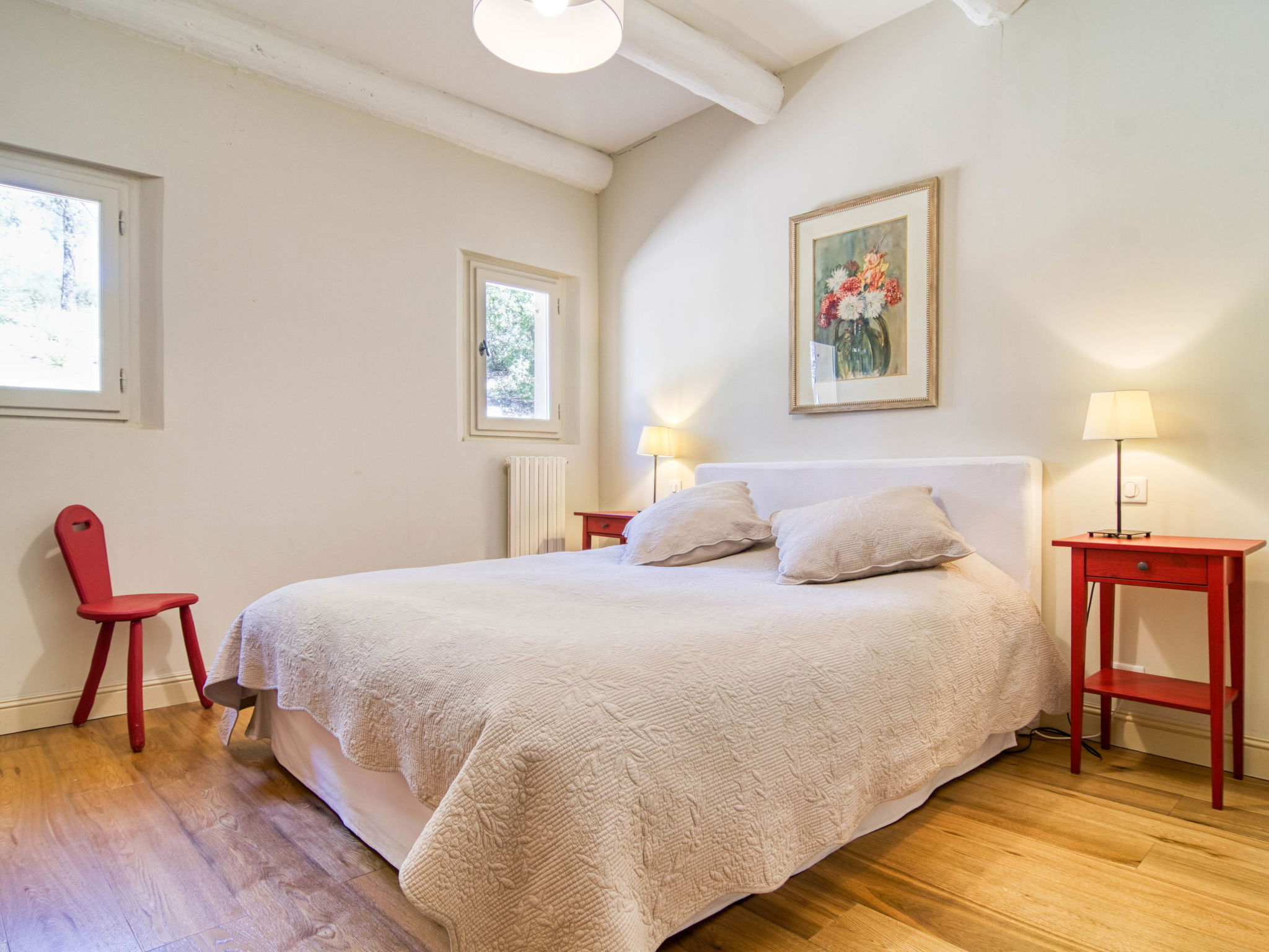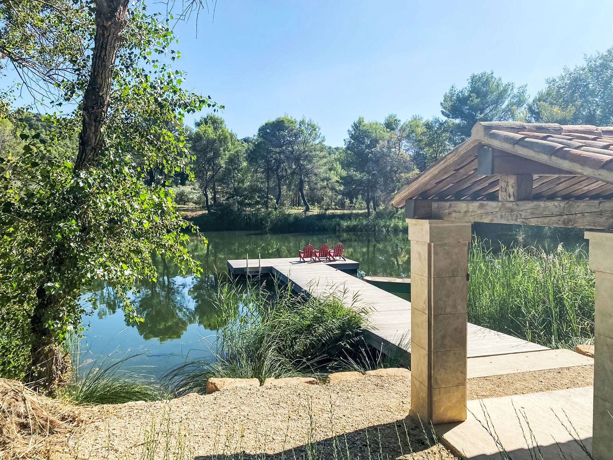 Located on land made up of woods, an olive grove and a lavender field. Available: plancha. Petanque pitch in front of the house. Pond at 150m with pontoon. two fountains on the property. On request, in addition, possibility of securing the services of a caterer or cook. Very beautiful house 2 storeys, surrounded by trees. Outside the resort, in a secluded, quiet, elevated position. Private: park 32 ha with trees, pond, swimming pool (12 x 6 m, depth 100 - 180 cm, seasonal availability: 01.May. - 30.Sep.) with internal staircase and shutter cover. Boules, terrace (20 m2), garden furniture, bathing jetty, pool maintenance by the owner/gardener. In the house: central heating system. Linen change (suppl. charge extra). Towel change (suppl. charge extra). Room cleaning daily on request (extra). Cook on request (extra). 1.7 km long bumpy motor access (via unmade road). Shop 5 km, restaurant 5 km, bus stop "Régusse" 8.5 km. Golf course (18 hole) 15 km, tennis 10 km. Please note: car recommended.