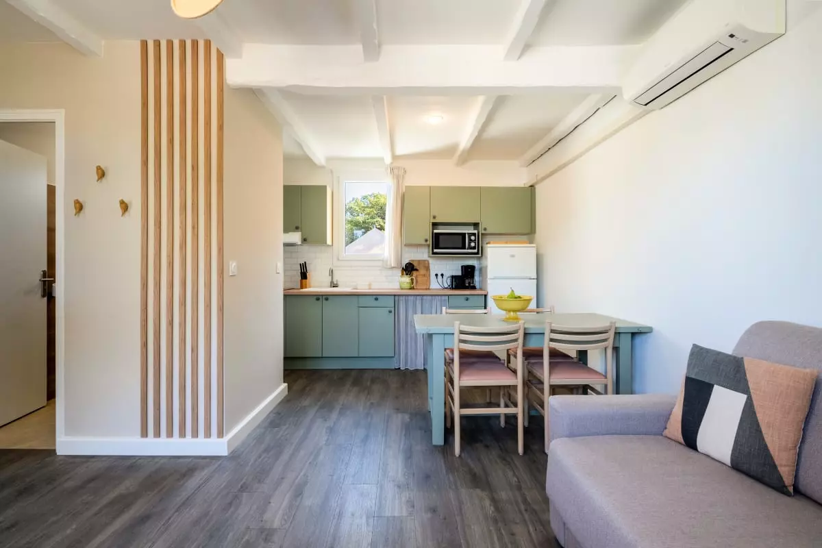 Recently fully renovated, this comfortable retreat features a cozy bedroom with a 140cm double bed and a single bed. The living room has a sofa bed that comfortably sleeps two, allowing for a total capacity of up to five people.