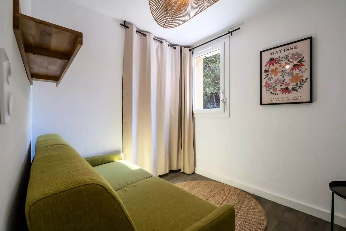 This comfortable retreat, recently fully renovated, offers one bedroom with a 160cm double bed and a single bed, and a second bedroom with a sofa bed for two people, allowing it to accommodate up to five guests.