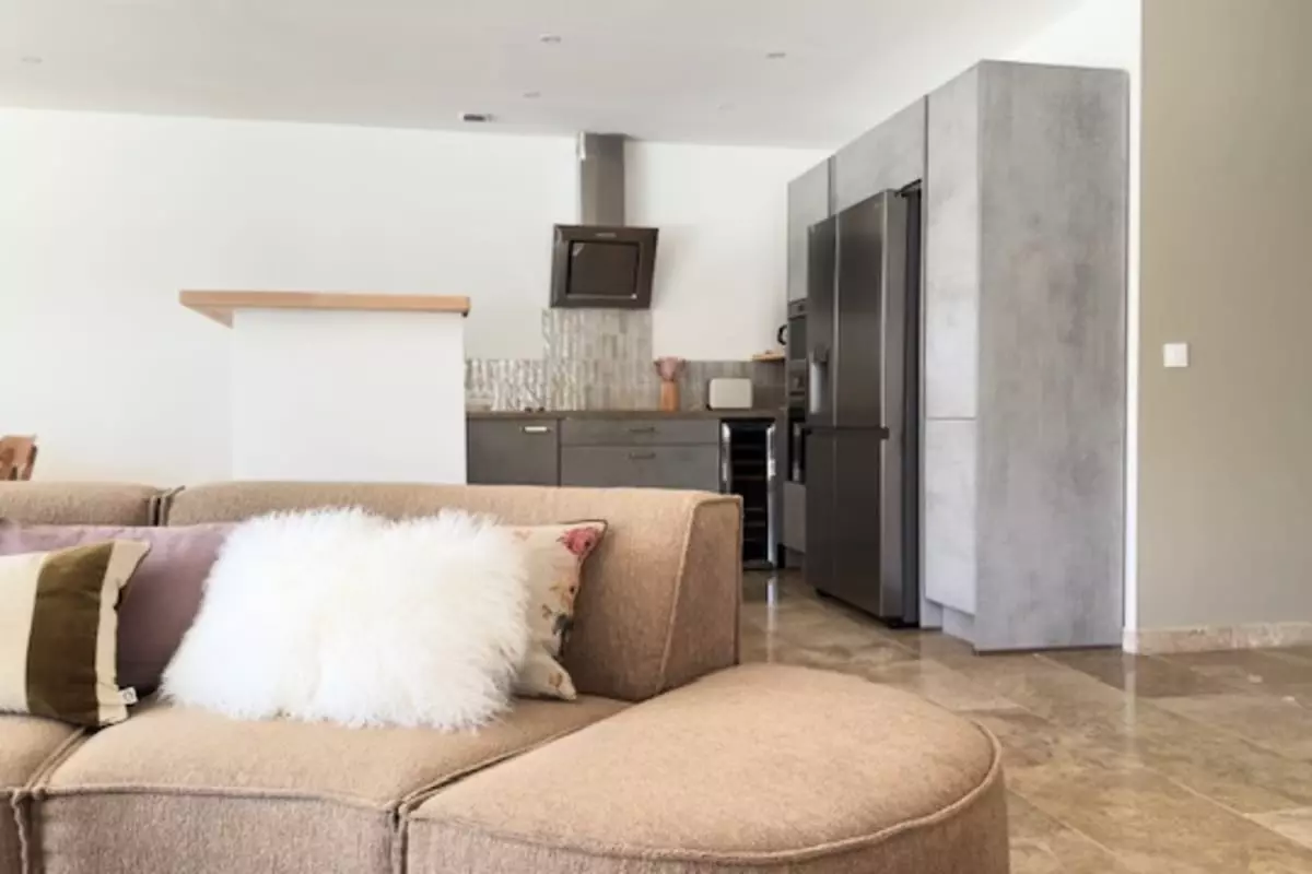 It is organized around a large open living area including a modern kitchen, a convivial lounge and a dining area, offering a natural continuity between interior and garden.