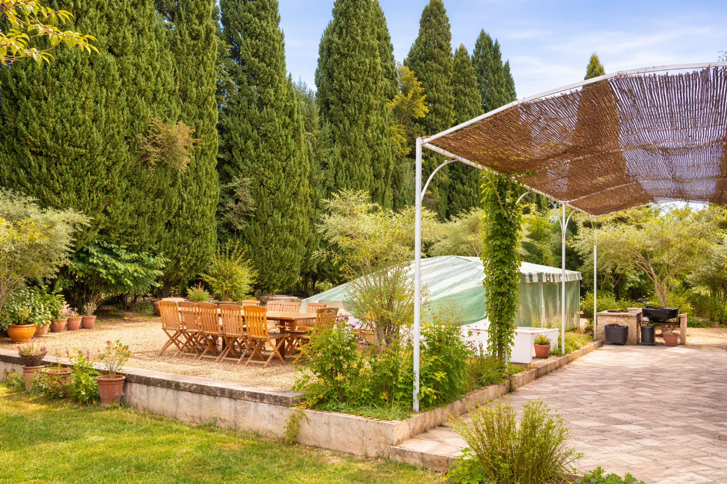 A charming dining area sheltered by a pergola welcomes lunches in the shade and long summer evenings.