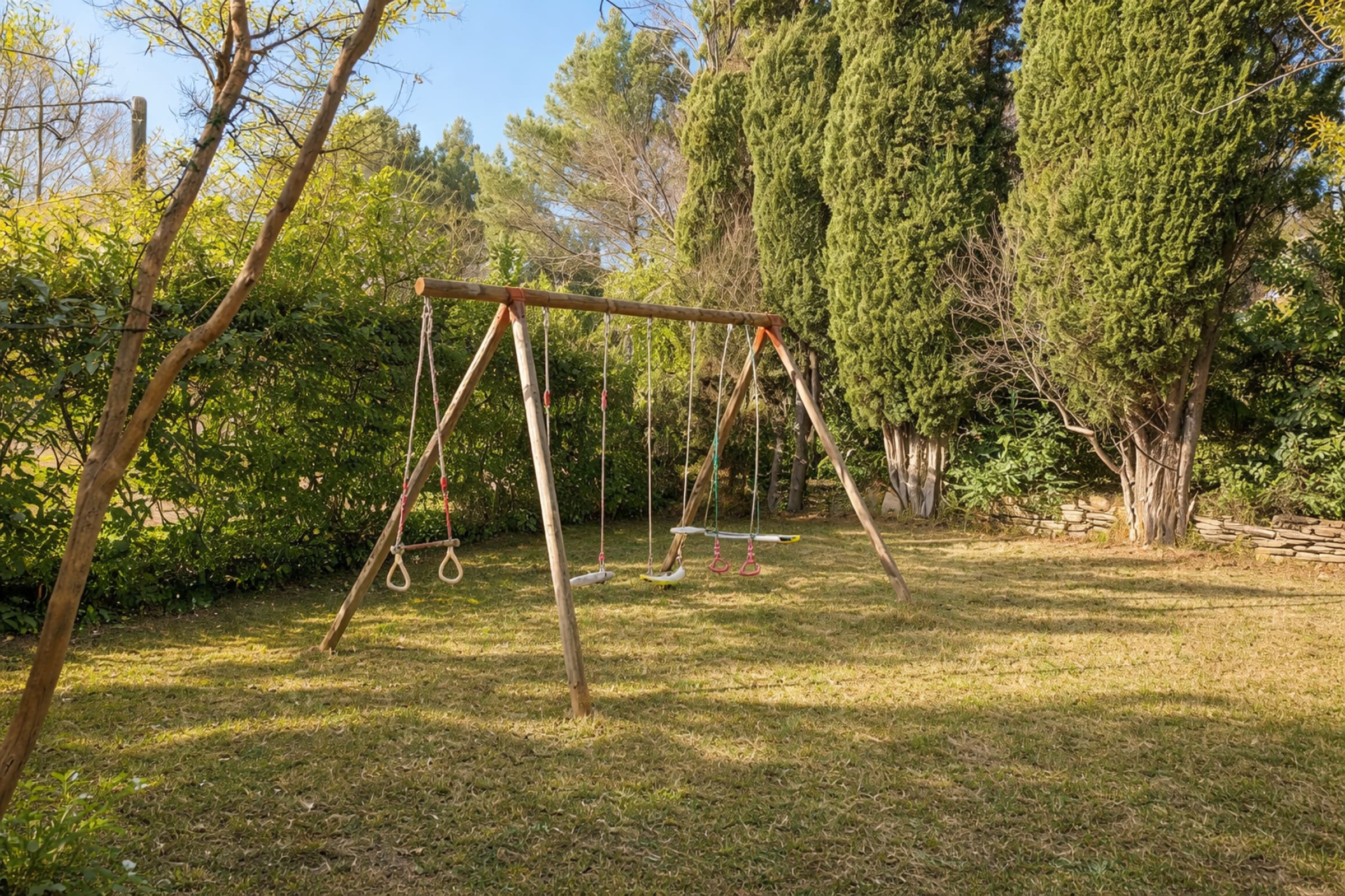 The terrace adjoins a small pétanque court, perfect for moments of sharing and conviviality, while a swing adds a touch of lightness and naturally invites playfulness and carefree joy.