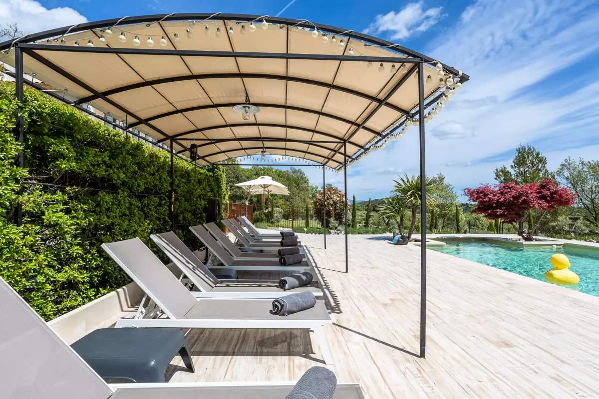 A heated swimming pool (10 x 5.5 m) surrounded by sun loungers and offering a superb view of the Luberon