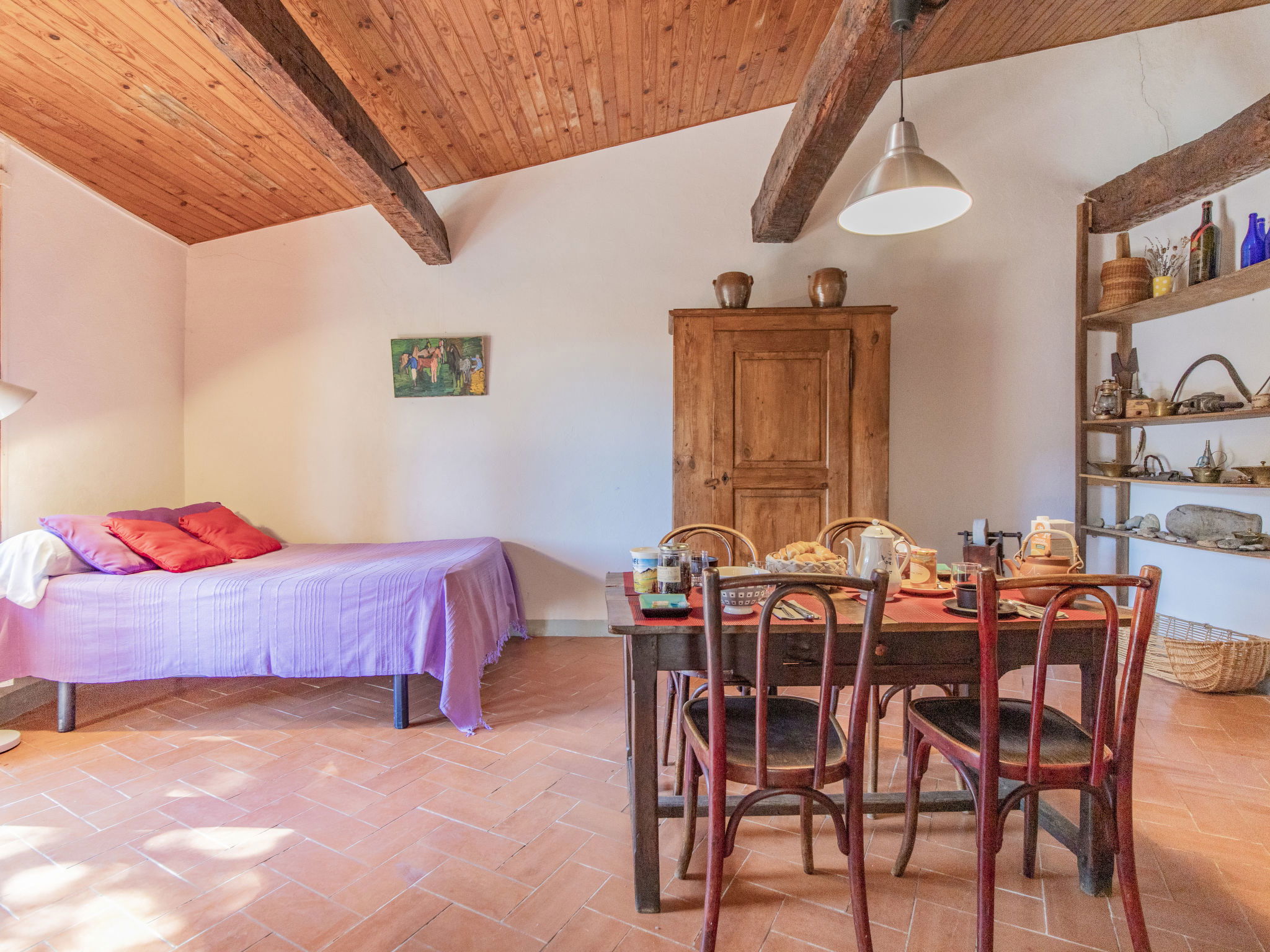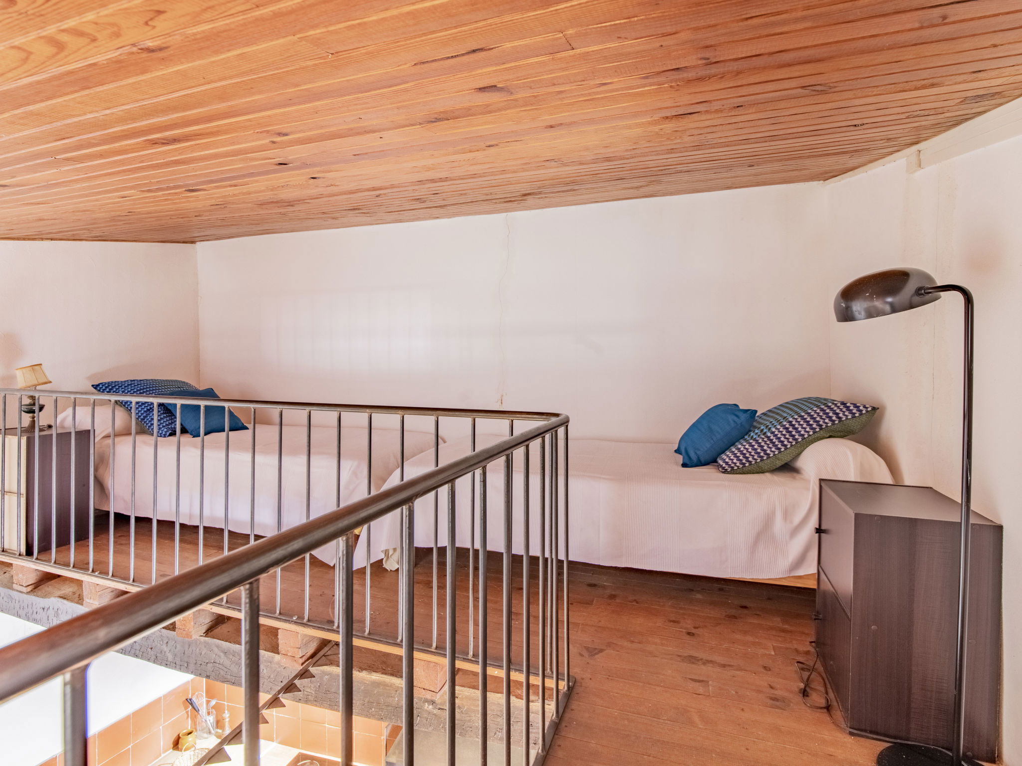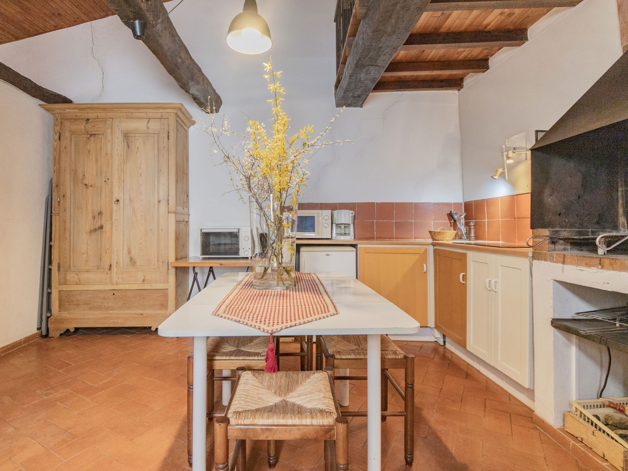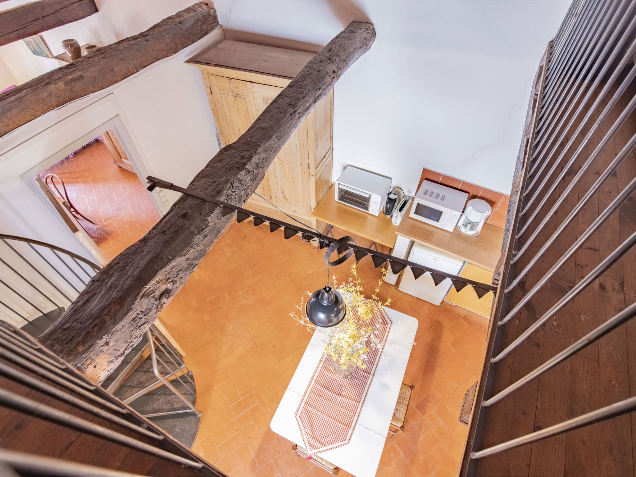 "L'Amandier", 1-room terraced house 40 m2 on 2 levels, on the upper ground floor. Rustic and cosy furnishings: living/sleeping room with 1 french bed, dining table, radio and CD-player. Open kitchen (mini-oven, dishwasher, 3 ceramic glass hob hotplates, toaster, kettle, microwave, electric coffee machine) with dining table, open-hearth fireplace. Exit to the terrace. Shower/WC. Upper floor: (spiral staircase) open small gallery with sloping ceilings, ceiling height 130 - 170 cm, without wardrobe with 2 beds. Electric heating. Small terrace, patio. Terrace furniture, deck chairs (2). Beautiful view of the countryside. Facilities: iron. Internet (WiFi, free). Maximum 1 pet/ dog allowed. Instead of an enclosed bedroom, some sleeping areas are located in an open-plan area (gallery, alcove, etc.).