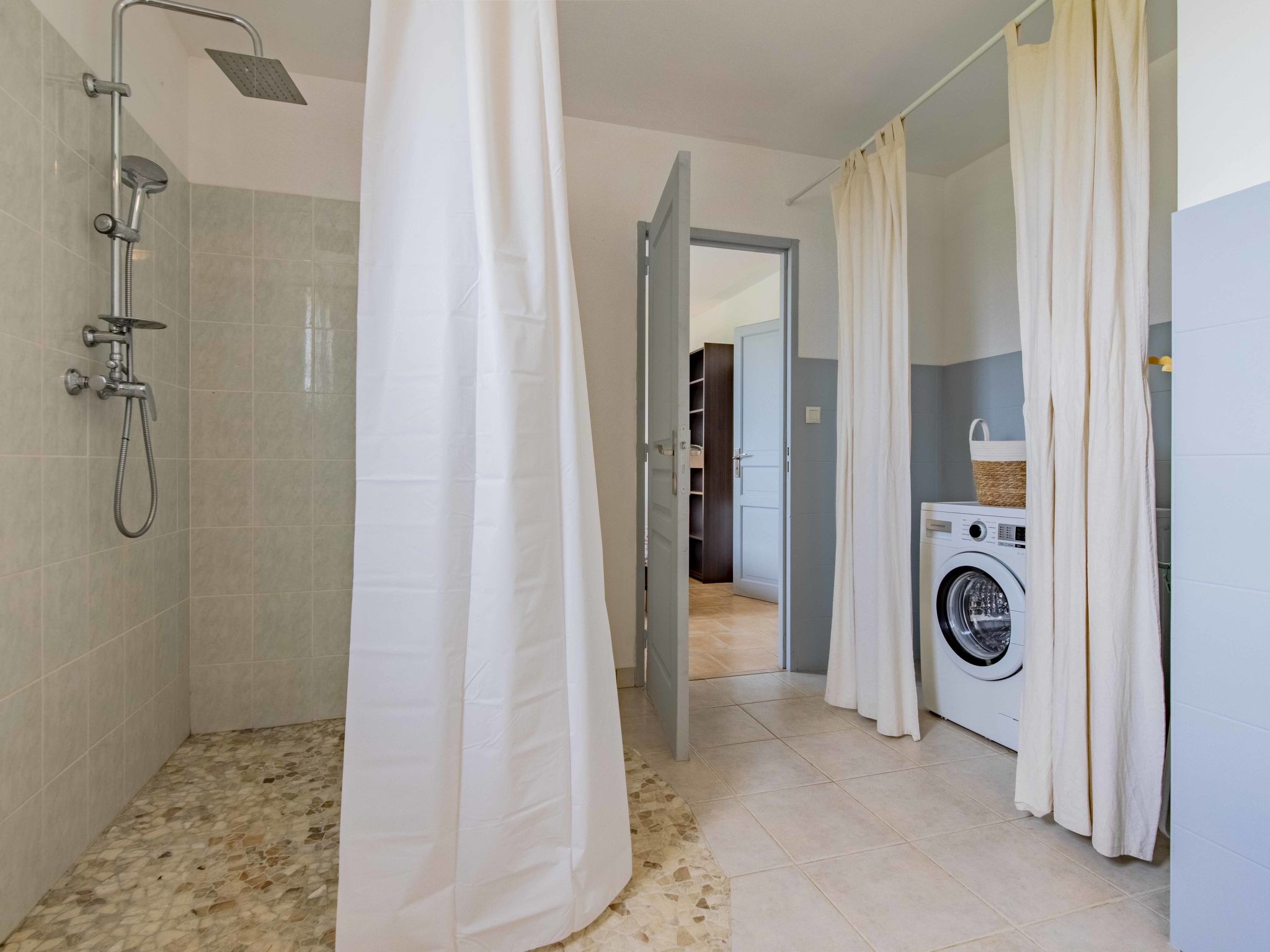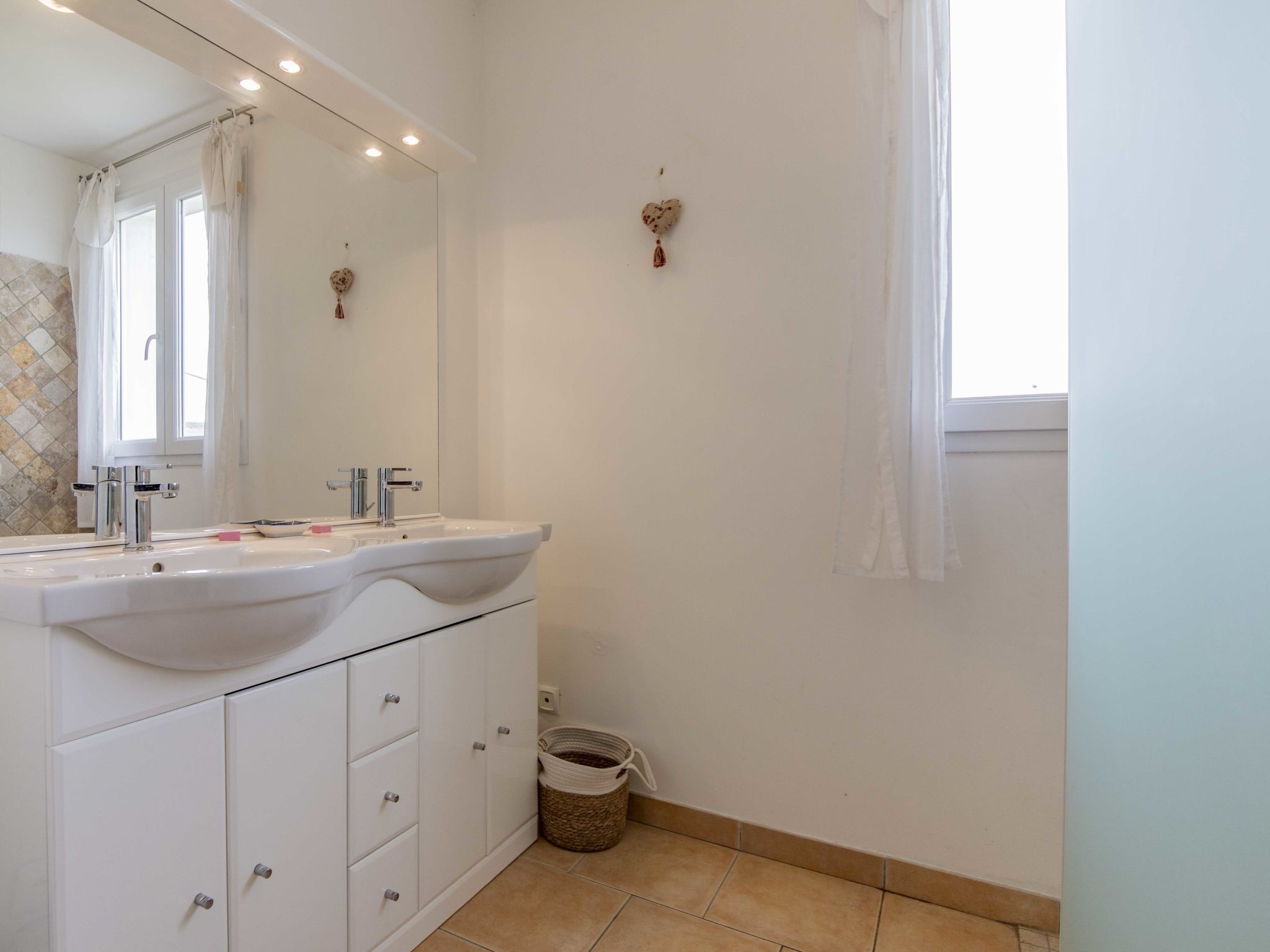 4-room villa 120 m2. Living/dining room 45 m2 with TV (flat screen). Exit to the terrace. 1 room with 1 double bed (160 cm, length 200 cm), separate WC, shower and TV (flat screen). 1 room with 1 french bed (160 cm, length 200 cm), shower. Exit to the terrace. 1 room with 1 french bed (160 cm, length 200 cm), shower. Open kitchen (5 hot plates, oven, dishwasher, microwave, freezer, electric coffee machine). Sep. WC. Electric heating, air-conditioning. Terrace 80 m2 partly roofed, porch. Facilities: washing machine, iron. Internet (WiFi, free). Suitable for families.