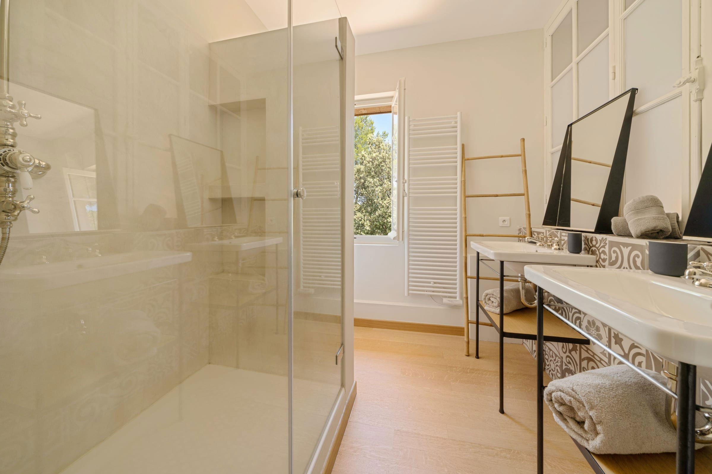 - Bathroom with a large shower, 2 wash basins and toilets