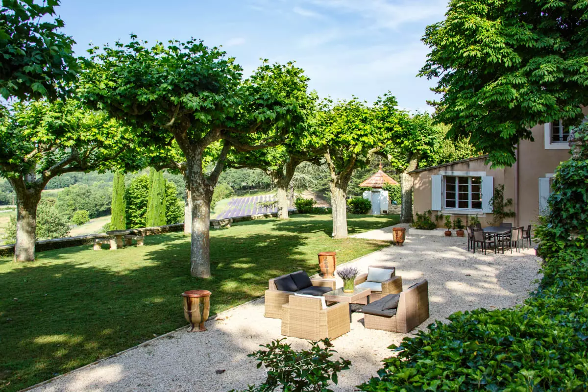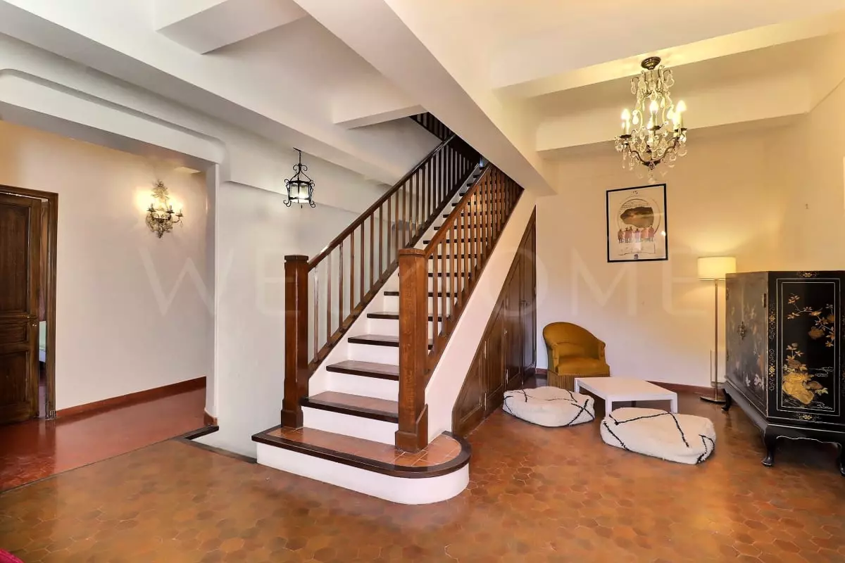 Inside, authenticity meets elegance: ancient stone, a majestic 17th-century staircase, wrought iron chandeliers, and terracotta tiles create an ambiance that's both rustic and refined. The French-style living room, with its imposing stone fireplace, is the warm heart of the country house. The fully equipped kitchen and authentic dining room promise joyful and memorable meals.