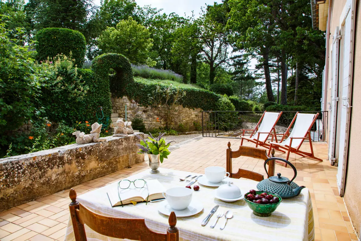 The private pool, perched high above the country house, offers panoramic views of the picturesque landscapes of the Vaucluse Mountains, the Luberon massifs, and the Rocher de Saignon. Imagine yourself diving into sparkling waters, while the scent of lavender and the chirping of cicadas accompany your sunny days. Shaded by a centuries-old oak tree, the large terrace invites you to enjoy convivial meals or simply relax at any time of day.