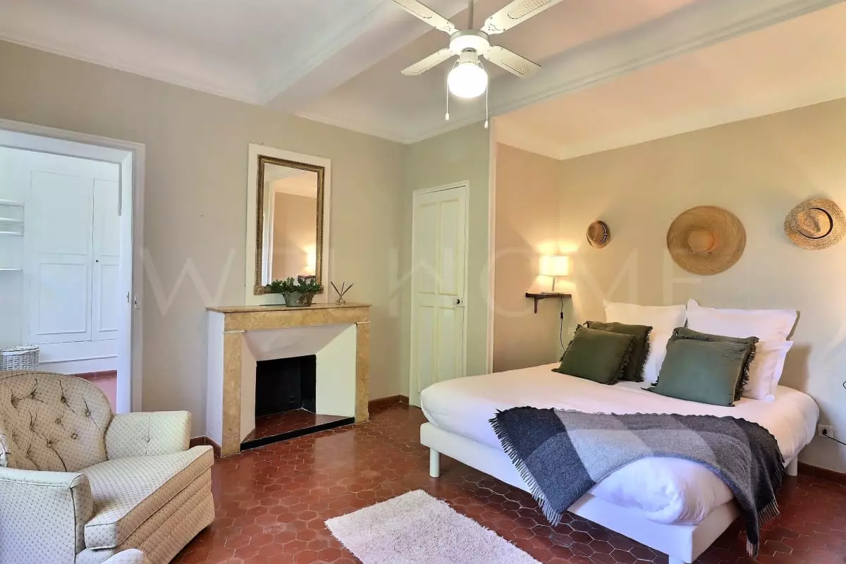 - Suite 4: Master bedroom of 22 m² with old fireplace, bathroom of 13 m² with bathtub and toilet, exceptional view of the Lubéron massifs and the park, queen size bed 160x200.